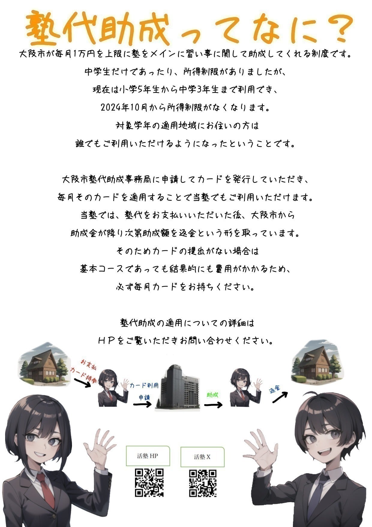 大阪市は塾代助成という制度があります。毎月1万円を市から助成してもらえるものです。