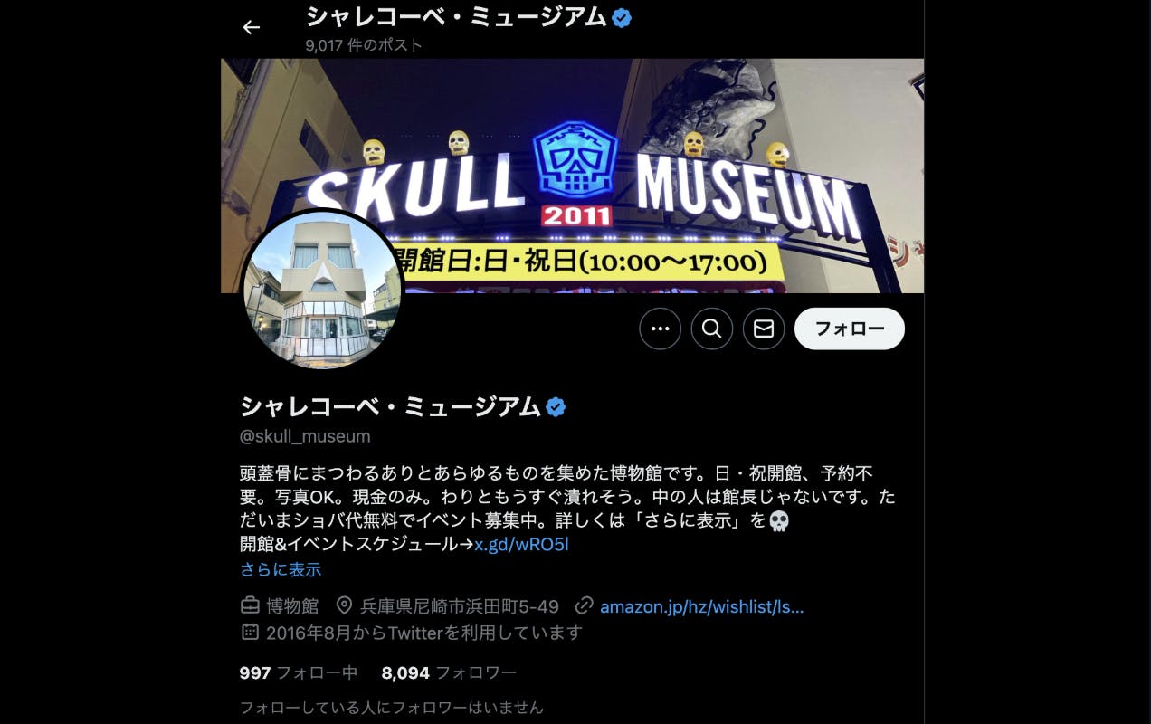 シャレコーベミュージアムは、兵庫県尼崎市浜田町にある頭蓋骨博物館で、約8,000点のドクロのコレクションを所有しており、その中の1,000点を常時展示しています。