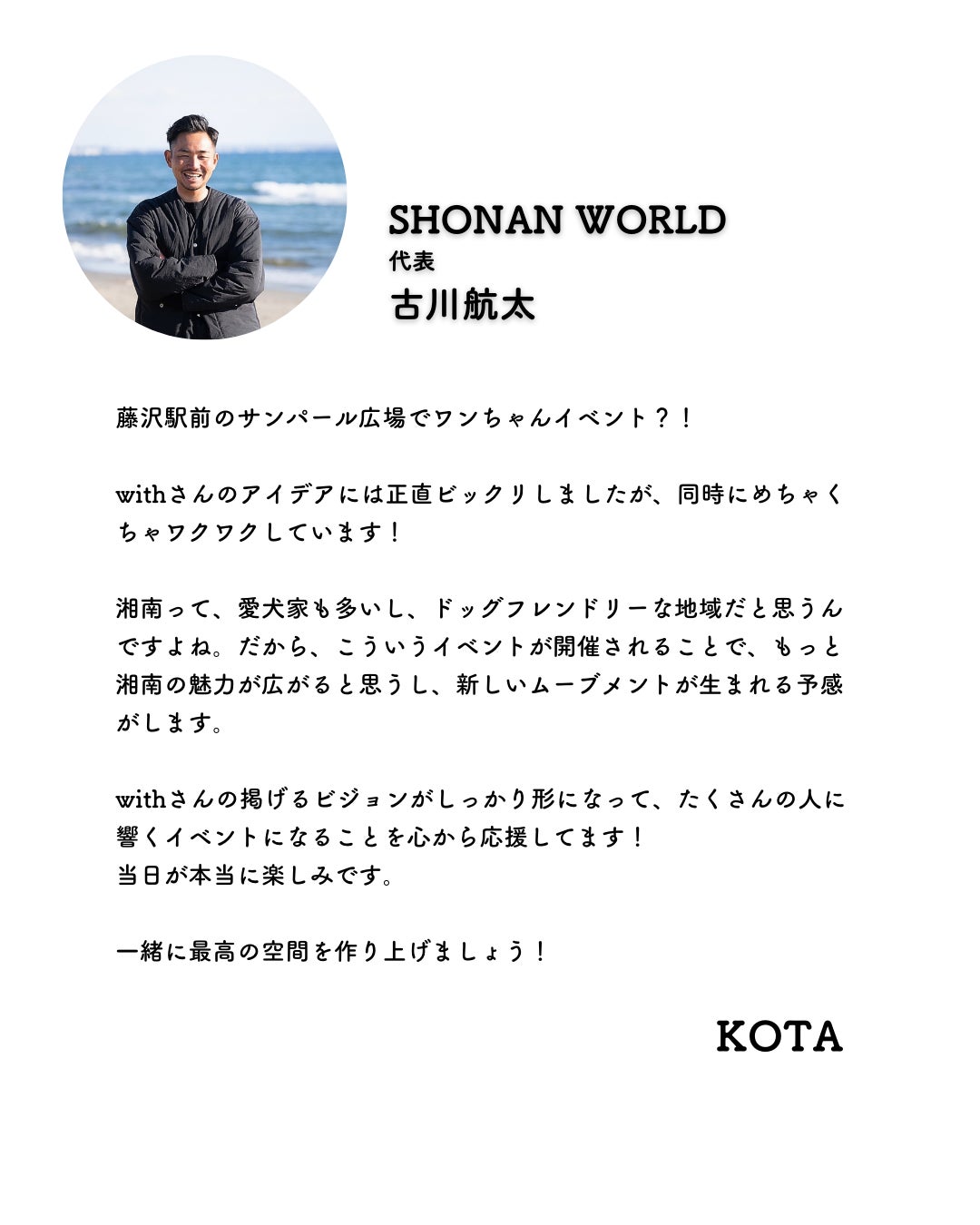 藤沢市は10世帯に1頭のわんちゃんが暮らす愛犬家に理想的な地域でもあり、この地から私たちの想いを発信したいと考えています。
