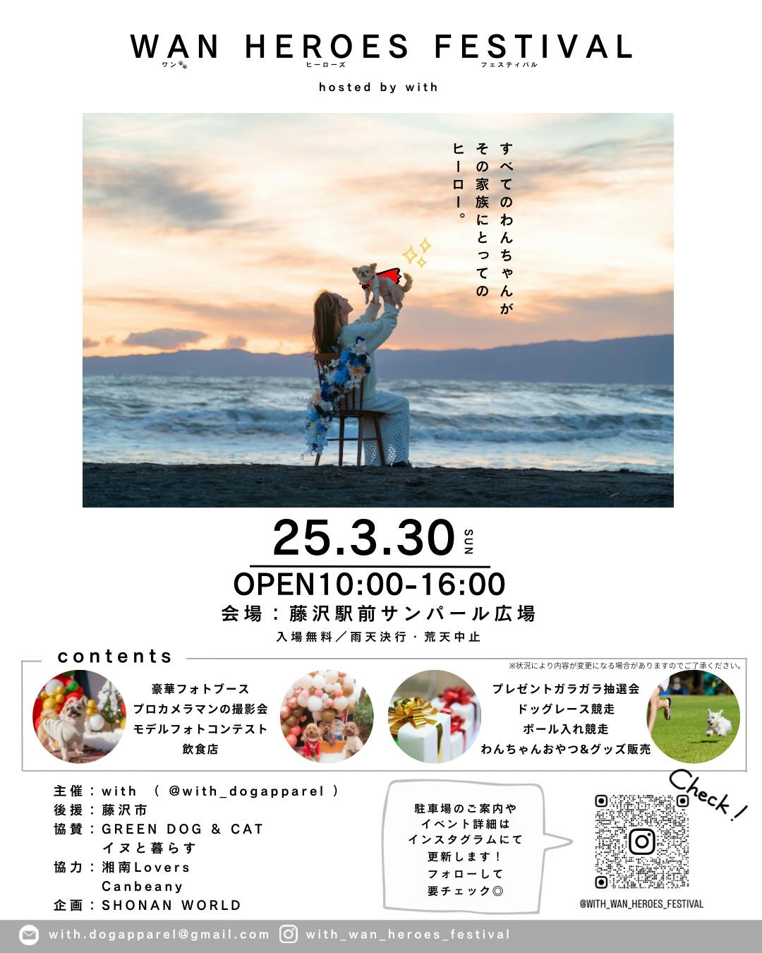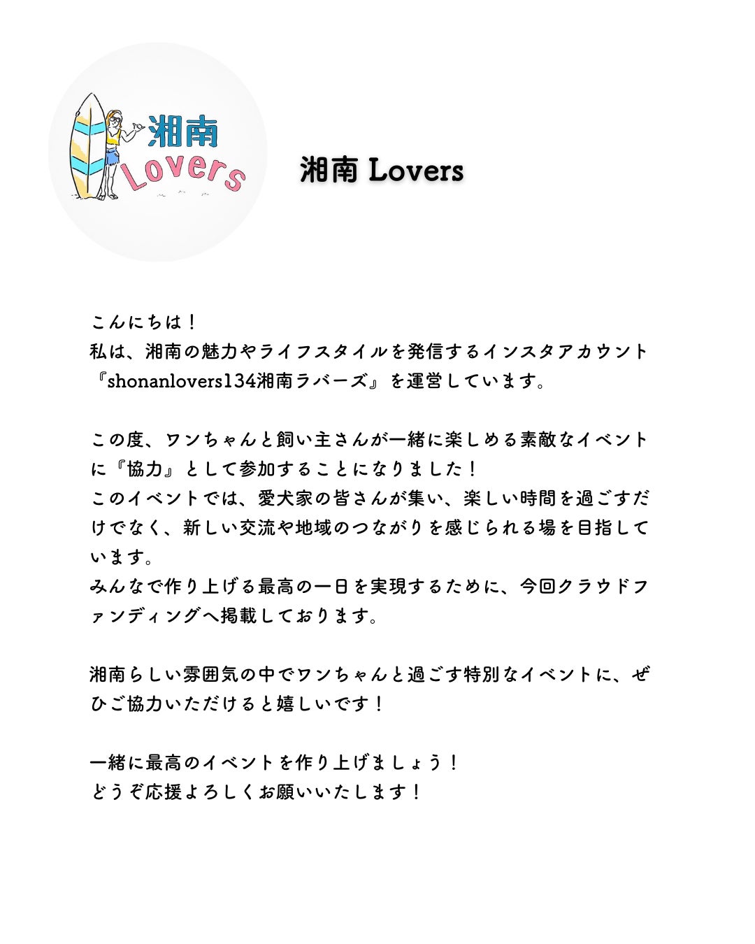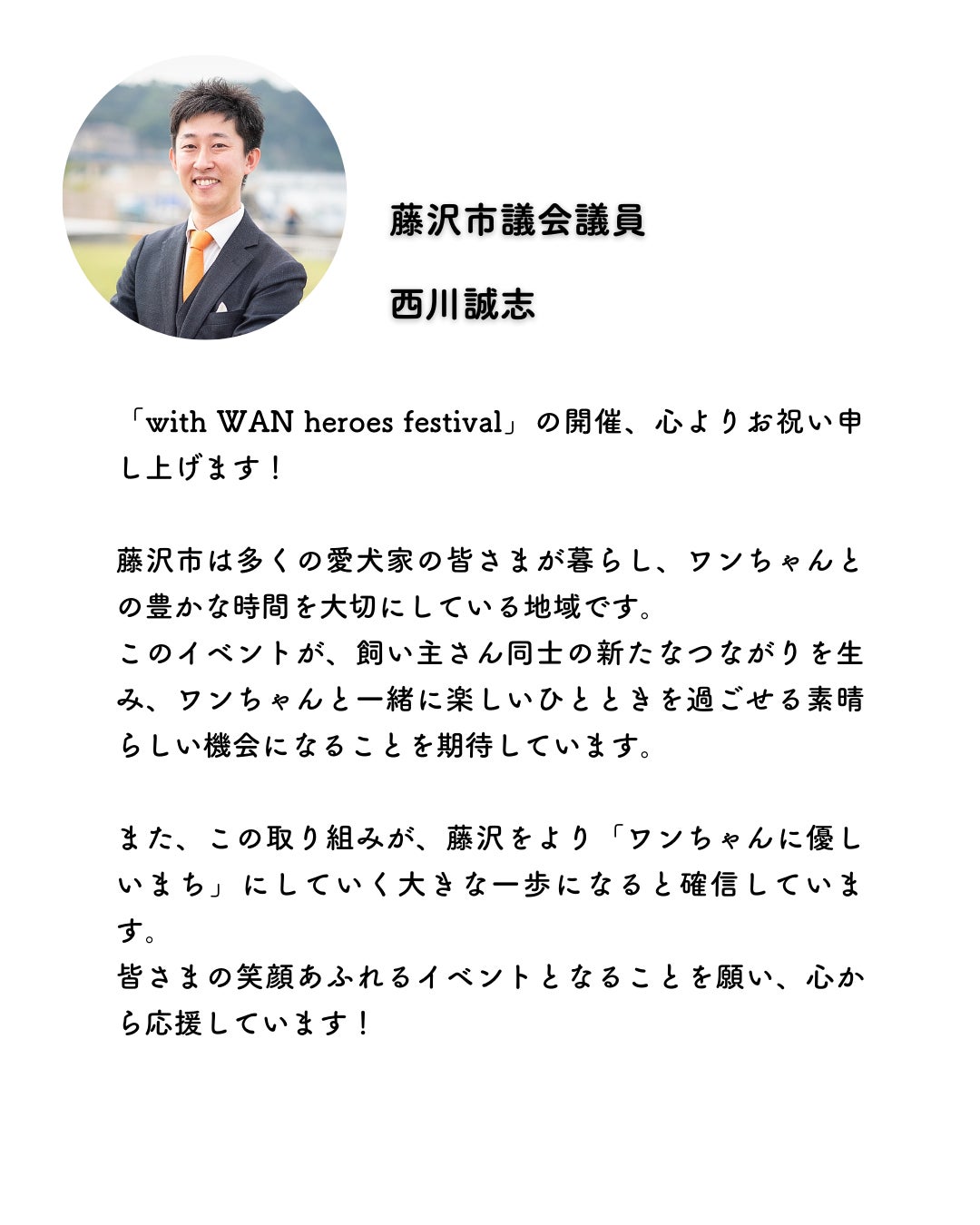 2025/02/16 17:44皆さま、こんにちは。この度、愛犬と飼い主が共に楽しめる新しいわんちゃんイベント『with WAN heroes festival』のクラウドファンディングを開始いたしました!藤沢駅北口サンパール広場にて、2025年3月30日に開催を予定しております。愛犬家の皆さまが心から楽しめる特別な1日を創り上げるため、ぜひご支援とご協力、また、シェアをお願いいたします! もっと見る