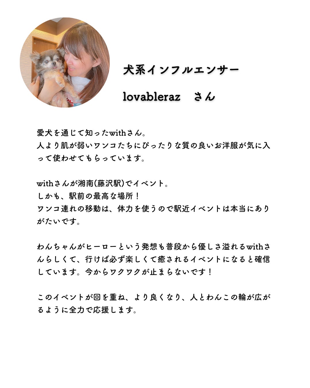 with dogapparelとして、洋服だけではなく、イベントも含め、すべてにおいて「わんちゃんと飼い主さまの幸せ」を実現したいと考えています。