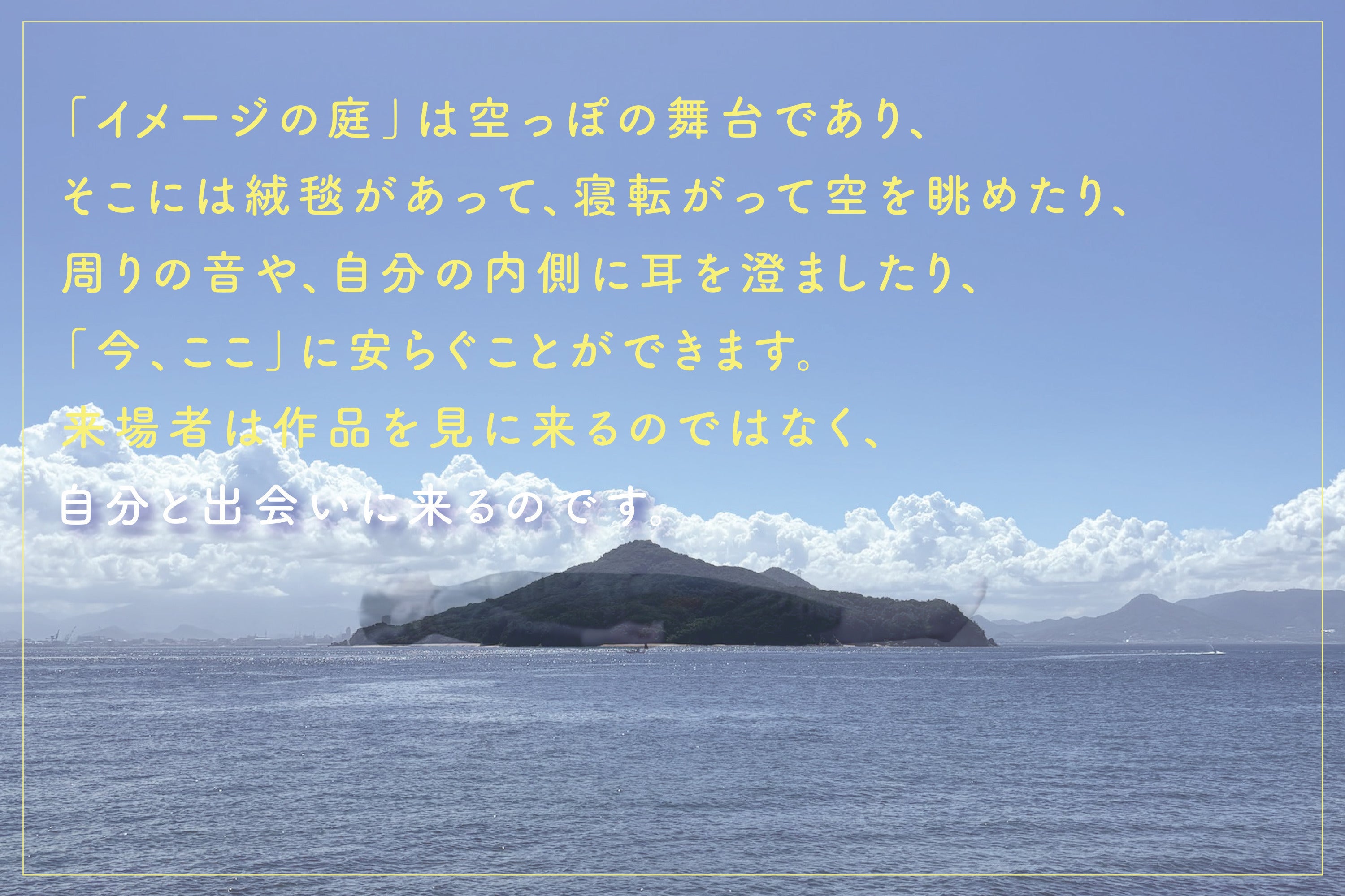 「イメージの庭」は、瀬戸内海に浮かぶ女木島に建つ一軒の家屋、"MEGIHOUSE"を舞台とします。自然豊かなロケーションの特徴を生かし、忙しい現代生活を送る人々に、ほっと安らぐ空間で自分を見つめリセットする「時」をおくります。