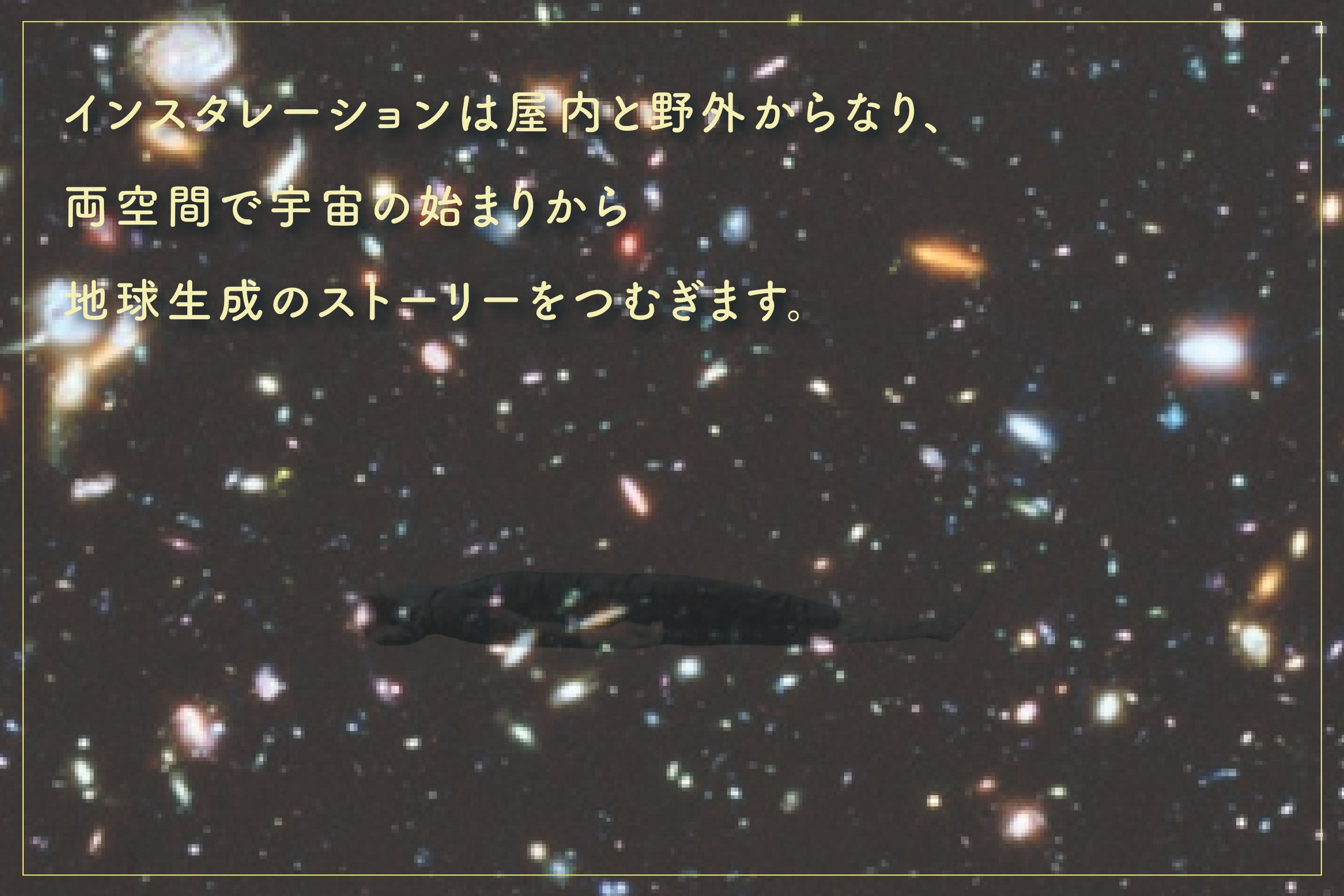 ◆展示空間と、周りの環境全体を作品として捉えながら、地球生成のストーリーを、宇宙の始まりから象徴的に描きます。