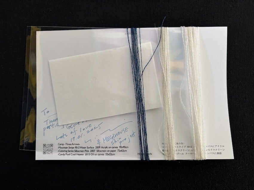刺繍キットの糸。ポストカードはガラスペンで手書きしています。