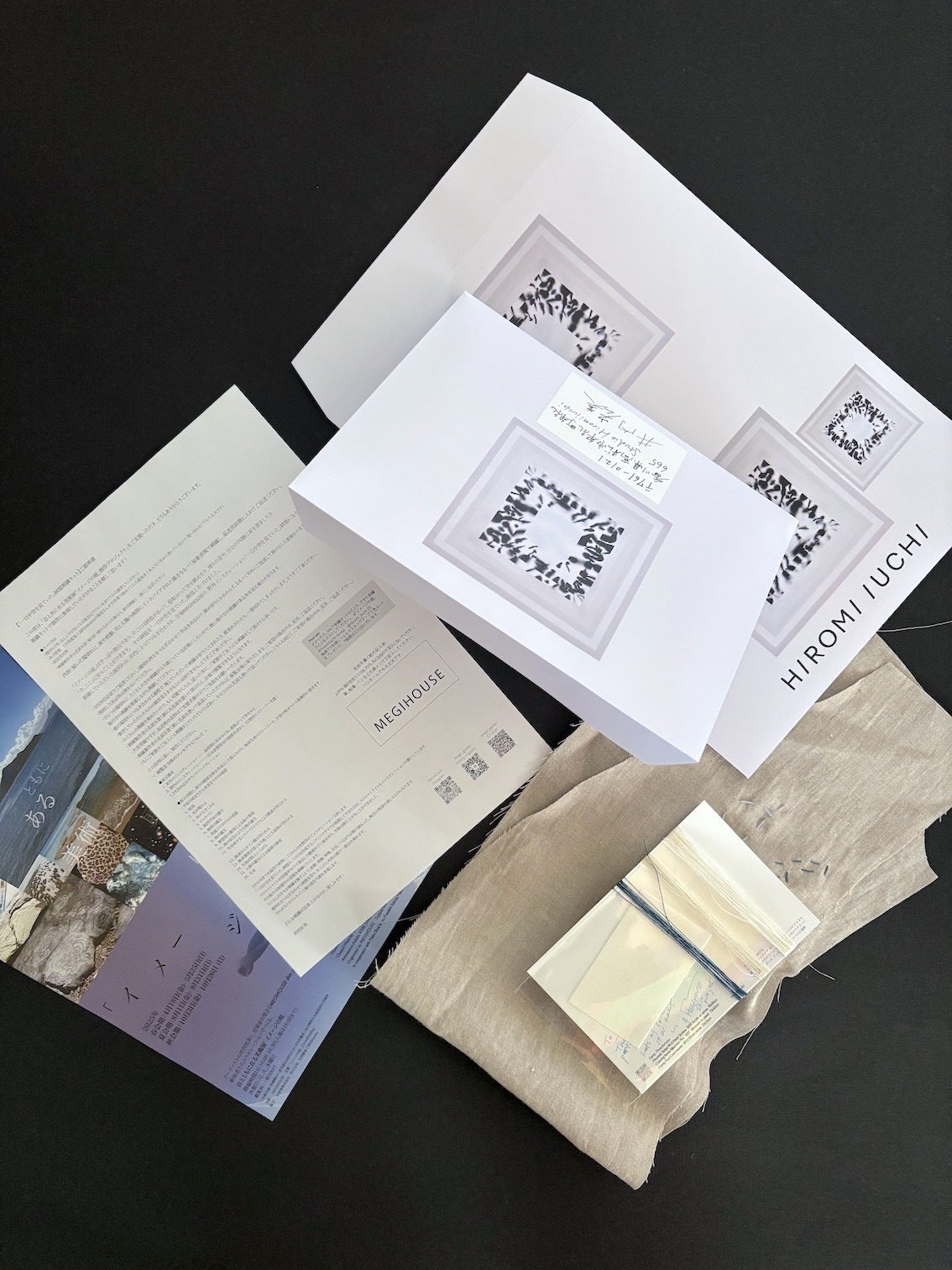 刺繍キット中身:端切れ、糸、ポストカード、展示の時はり出す名前を書く紙、説明書、チラシ。