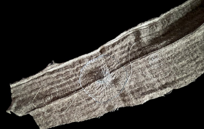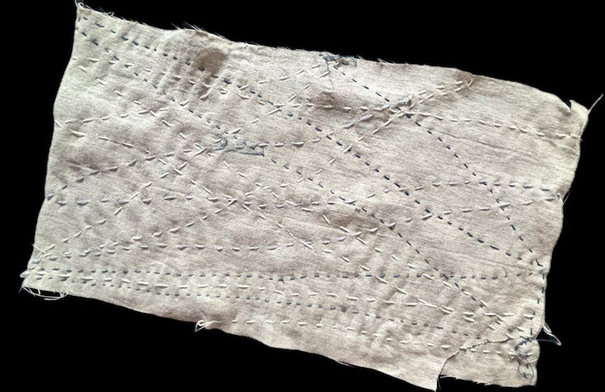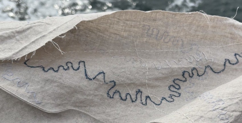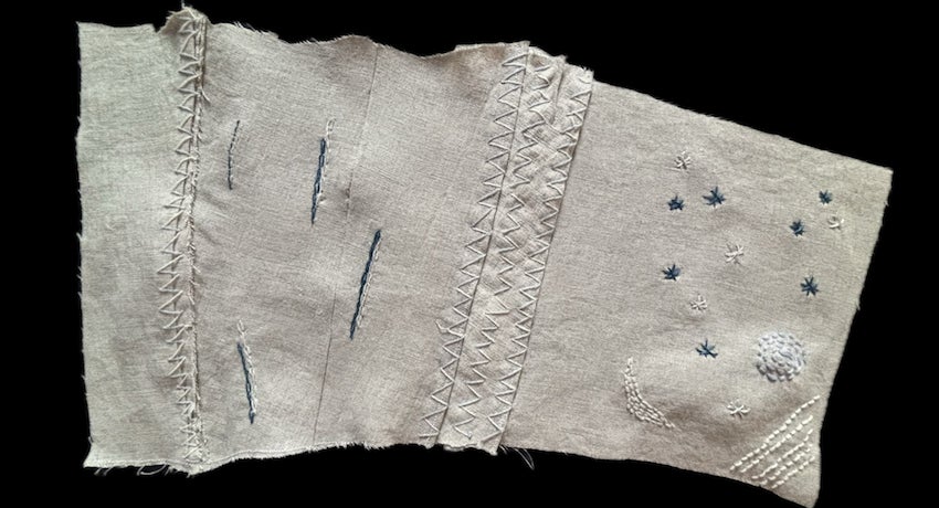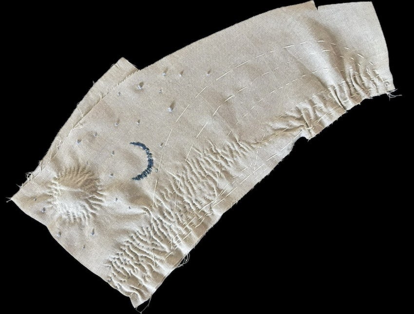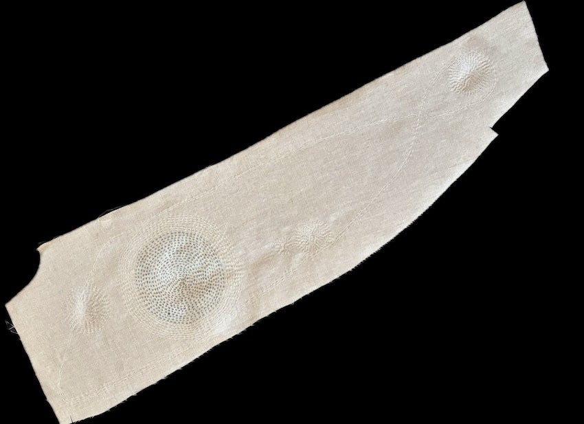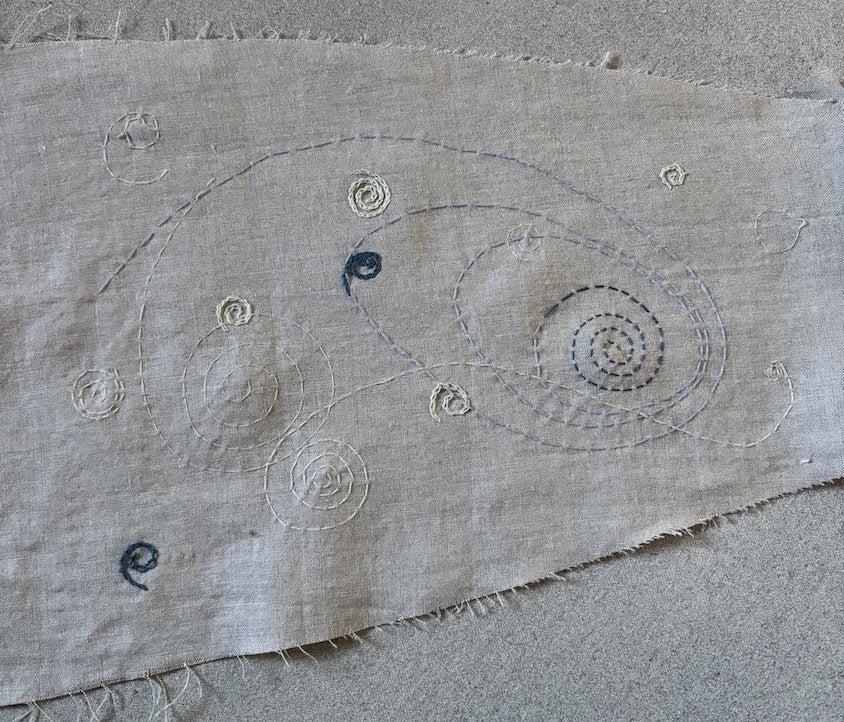 この方は2枚の端切れを刺繍してくださりました。1枚は銀河のような世界、もう1枚はミトコンドリア、または海岸線を想わせる曲線が繊細で美しいステッチで紡がれています。