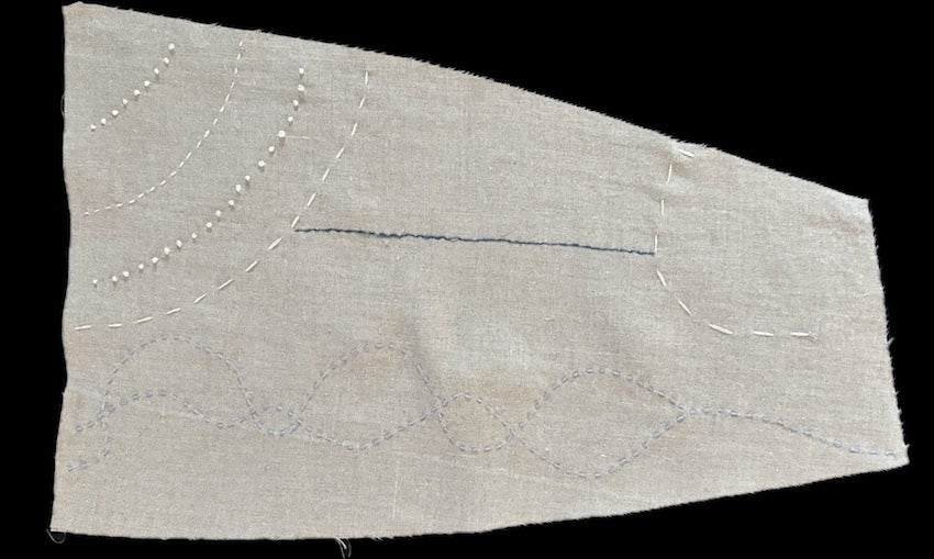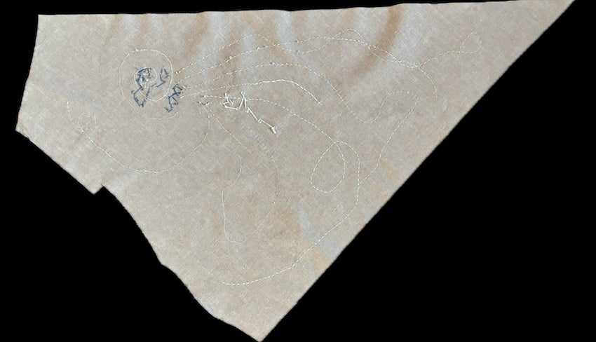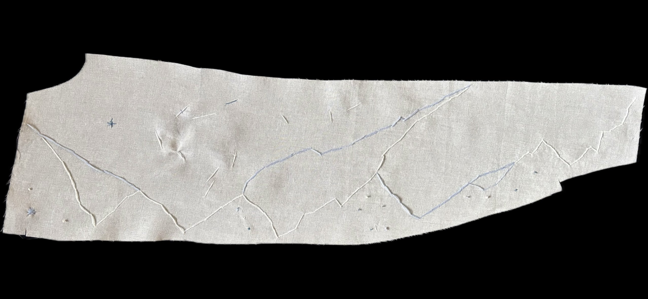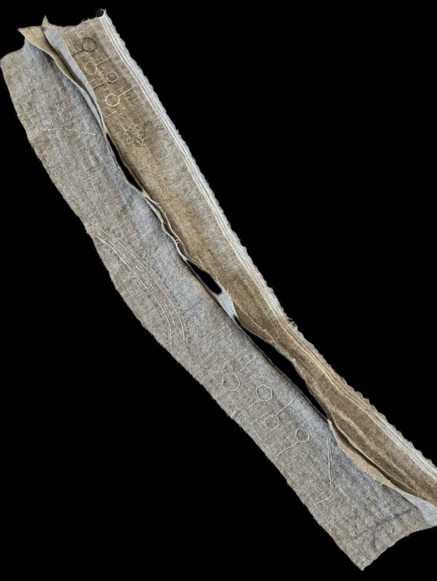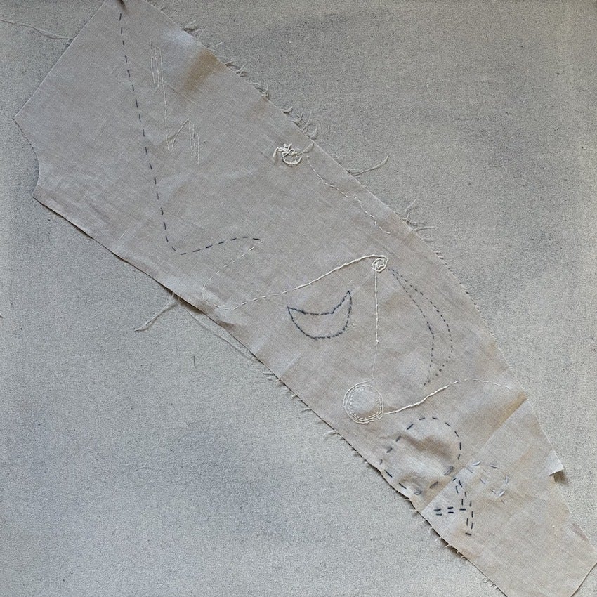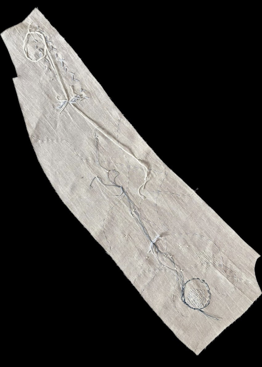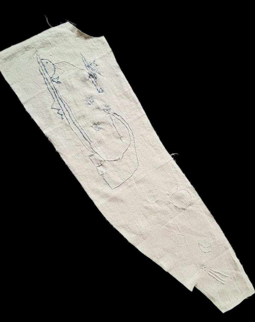 かなり変形の端切れの特徴をうまく活かして、天気、大気の動き、ロードマップを想わせる刺繍をしていただきました。 リズミカルに繰り返される記号は音符のようです。優しい世界観に癒されます。