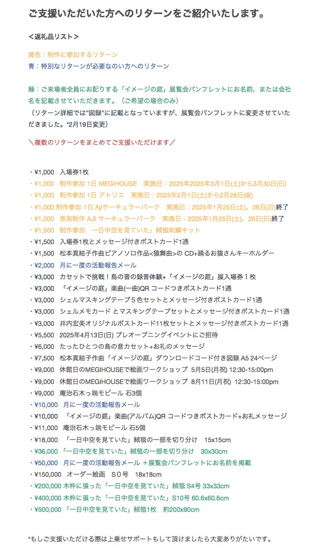 お名前記載つきの返礼品(緑インクで記載)を、ご来場者全員にお配りするパンフレットへのお名前、または企業名記載へ変更いたします。 ご支援よろしくお願いいたします。