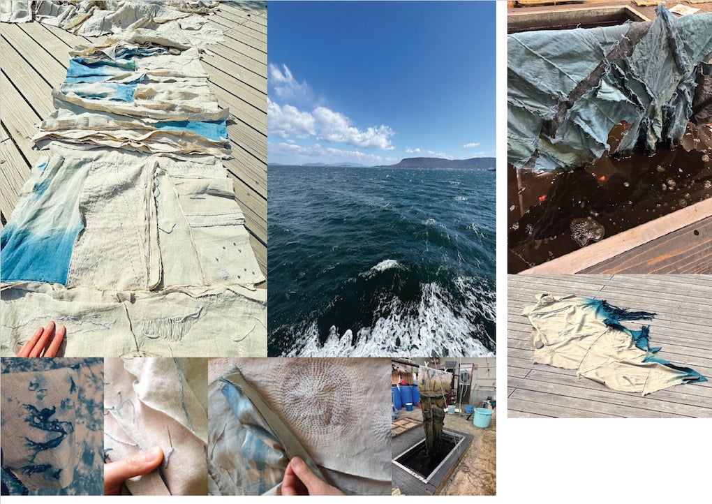 ・つないだ端切れの藍染を行うために天然藍染工房Khimairaを2度(12日、25日)訪れ、Khimaira堀尾さんと共に、染め作業を行いました。