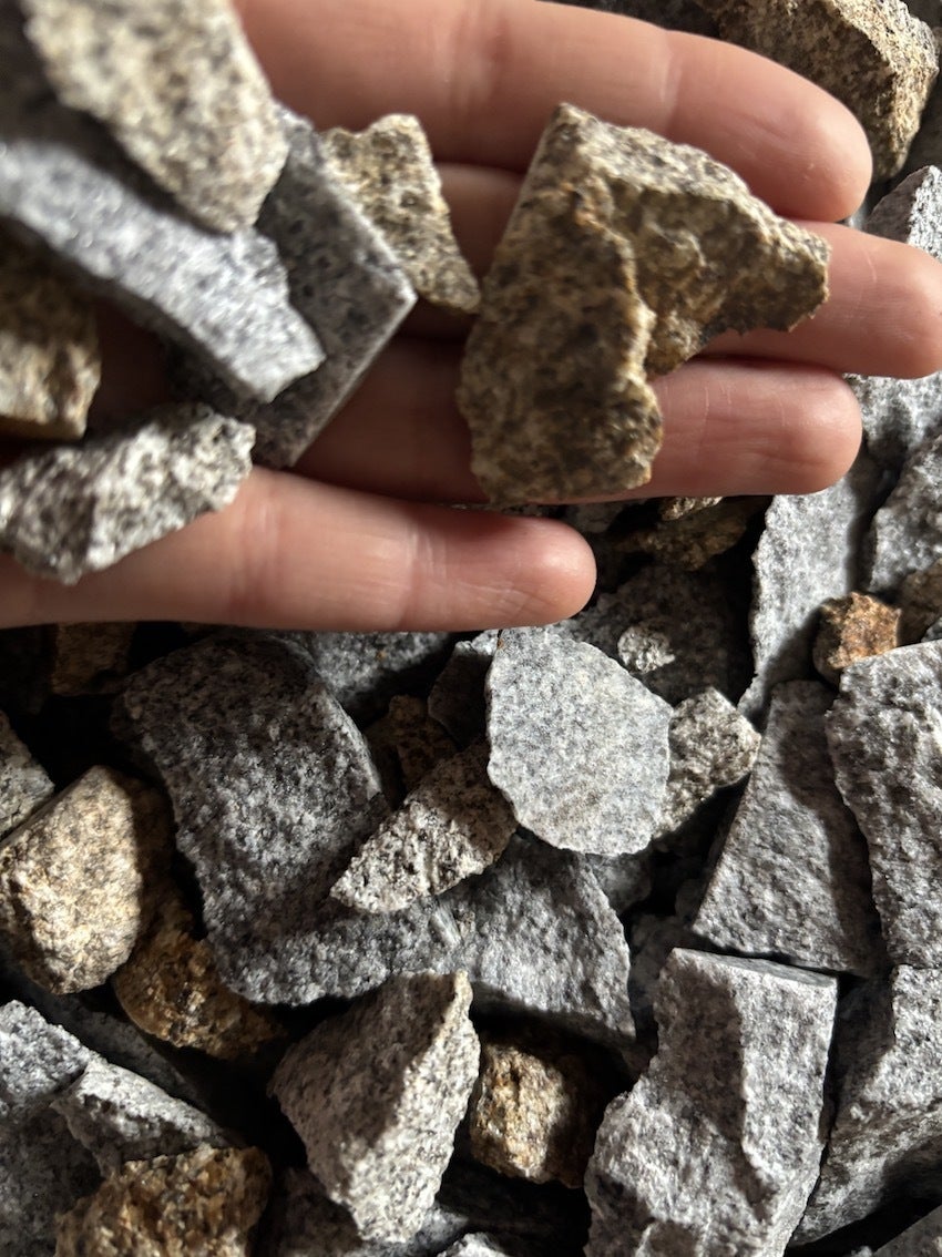 伏石さんが集めてくださった庵治石破片。丁寧に洗ってくださっていて感謝です。茶色いのは海水に浸かっていた表面部分だそうです。