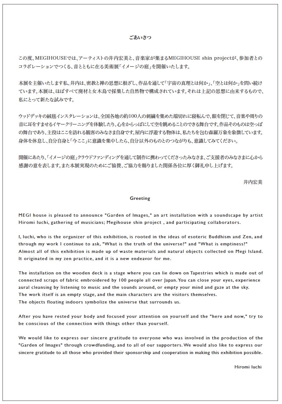 開催にあたり、「イメージの庭」クラウドファンディングを通して制作に携わってくださった皆さま、ご支援者の皆さまに心から感謝の意を表します。また本展実現のためにご協賛、ご協力を賜りました関係各位に厚く御礼申し上げます。
