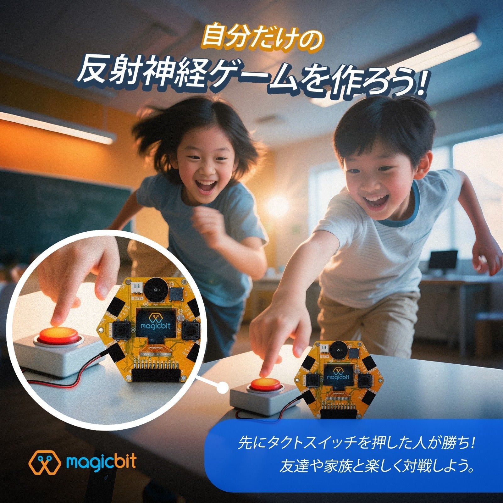 2025/05/15 11:54【番外編】早押しドキドキ判定機で兄妹対決!自由研究レポート:半日で完成!反射神経を数値化する装置づくりこんにちは!クラウドファンディングにご支援いただいた皆様へ、子どもたちが実際に作った「早押しドキドキ判定機」の活動報告をお届けします。どんなものを作ったの?Magicbitを使って、「誰が一番早くボタンを押せるか」をミリ秒単位で測定できる装置を作りました!兄妹で反射神経を競い合い、大盛り上がりの実験になりました。準備したもの(とっても簡単!) * Magicbit本体 * 押しボタン(タクトスイッチ)2個 * ブザー1個 * ジャンパーワイヤ数本実験結果:兄vs妹の反射神経対決!【3回勝負の結果】ラウンド1:兄350ms vs 妹420msラウンド2:兄330ms vs 妹405ms ラウンド3:兄340ms vs 妹390ms平均タイム:兄340ms vs 妹405ms子どもたちが学んだこと 1. 数字で見える反射神経:「速い!」という感覚が実際に数値で比較できて驚いていました 2. プログラミングの基本:「先に押した人だけ有効」という条件分岐を体験 3. データ分析の入門:記録を表にまとめて平均を出す作業が「本格的な研究みたい!」と喜んでいましたMagicbitの良さを実感!配線はたった3本、プログラミングもブロックを組み合わせるだけで完成!画面にすぐ結果が表示され、ブザー音でも反応するので、子どもたちは「自分で作った!」という達成感でいっぱいでした。この後どうなった?友達も呼んで「反射神経王決定戦」を開催!みんなで記録更新を目指して練習するうちに、最速300msを突破する子も現れました。「次は光センサーで反応する装置も作りたい!」と意欲満々です。----------------------------------------半日で完成する手軽さと、実際に動く喜びを体験できるMagicbitの魅力が詰まった実験でした。皆様のご支援のおかげで、子どもたちのプログラミングへの興味が大きく広がっています。これからも活動報告をお届けしますので、楽しみにお待ちください!詳しくはこちら もっと見る