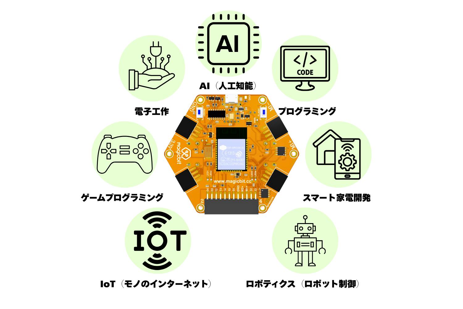 Magicbitは、電子工作やプログラミングをすぐに始められるオールインワンの開発ボードです。基盤には様々なセンサーや入出力機能が備わっており、追加のパーツなしで多くのプロジェクトに対応できます。