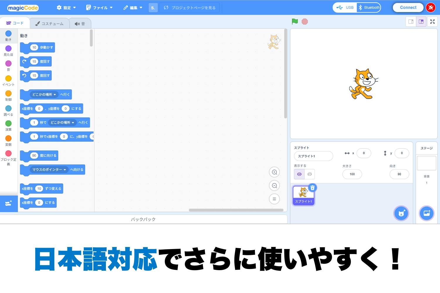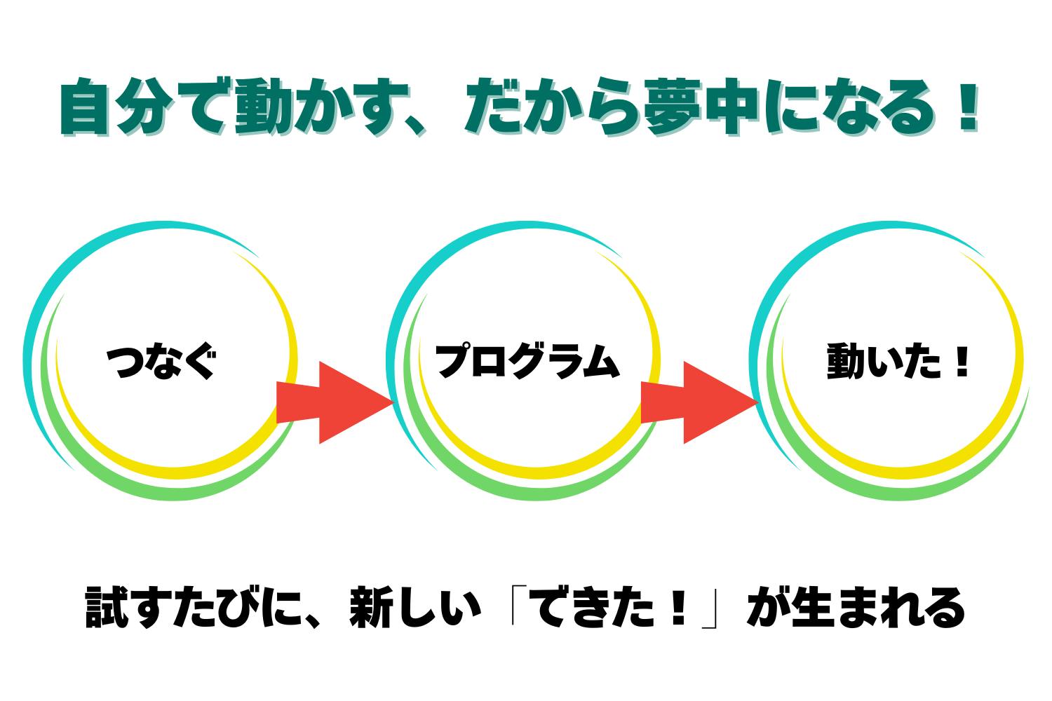・Scratch 風のドラッグ&ドロップ操作はそのままに、英語が読めなくても直感的に学べます