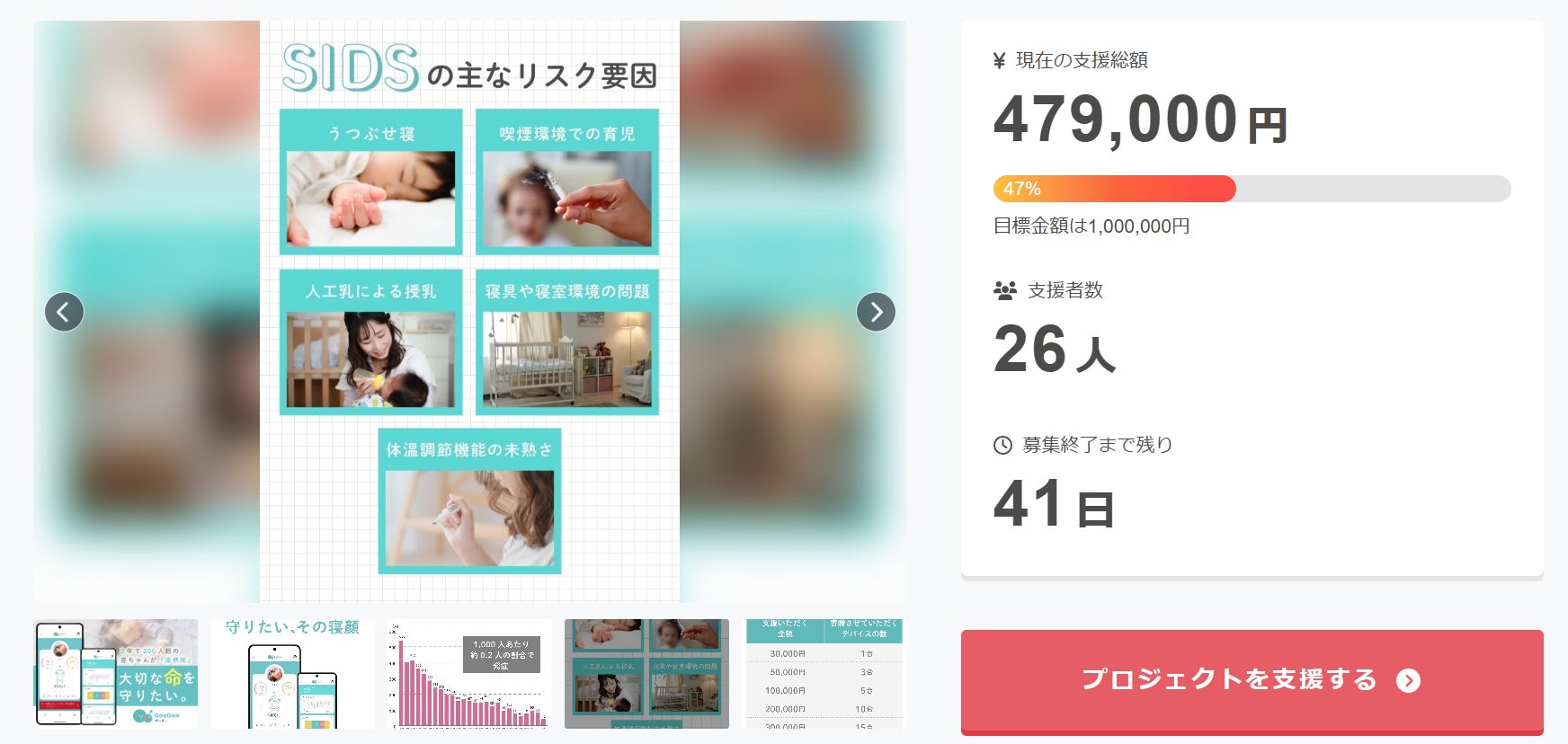 2025/09/04 10:25今日は、GooGooが取り組むテーマ「SIDS(乳幼児突然死症候群)」について少し触れさせてください。SIDSは、健康に見えた赤ちゃんが睡眠中に突然亡くなってしまう疾患で、原因はいまだに解明されていません。日本だけではなく世界的な症候群にも関わらずです。国内では年間50人近くが犠牲となっており、保育の現場やご家庭にとって大きな不安のひとつです。そしてなんと一番驚きなの...母体の喫煙やうつぶせ寝が発症率を高めるとされていますが、その説には何も根拠がなくこの認知が広がっているという現状です。私たちは「心拍」という医学的に意味のある指標をもとに見守ることで、午睡の安全性を高め、保育者やご家庭の不安を少しでも減らすことを目指しています。今回のクラウドファンディングでいただくご支援は、保育施設への寄贈と家庭向けモデルの開発に活用し、SIDSリスクを減らす社会づくりに繋げていきます。残りの50%、引き続き活動して参ります。昨日も大きな支援を頂き、ありがとうございました! もっと見る