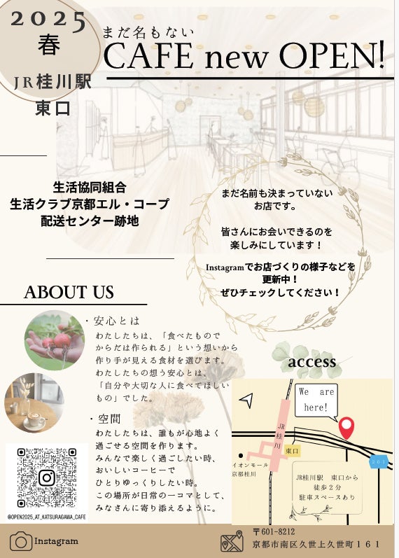 私たちは桂川駅東口にある、生活協同組合生活クラブ京都エル・コープの配送センターを、誰もがほっこりできて笑顔でいられるみんなの居場所に作り替えるためのプロジェクトで出会い、街の拠点となれるように、みんなが入りやすいカフェを作ろうと動き始めました。