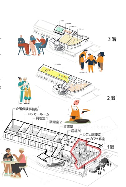 カフェが入る建物は誰もがほっこりできて笑顔でいられるみんなの居場所拠点として、多様な活動が建物内に集まり、3階は生活協同組合生活クラブ京都エル・コープ事務所と組合員室。2階は子どもの集まりが中心となるつどいの広場。1階は多様な働き方が出来るようにカフェ以外も準備中です。