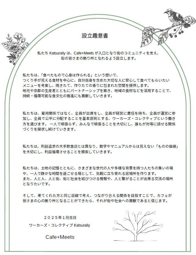 年齢も出身も経験もバラバラな私たちが、どんなカフェにしたいか、どんなカフェがあれば来てくれる人に喜んでもらえるかを考え話し合いました。自分たちの働き方も自分たちで決めるために☆雇う雇われる関係ではなく、自分たちが出資をして経営に責任をもつ。☆それぞれ出来ることを持ち寄ってニガテも助け合う。☆一人一票の権利を持ち共に働く「ワーカーズ・コレクティブ」という新しい働き方を選びました。
