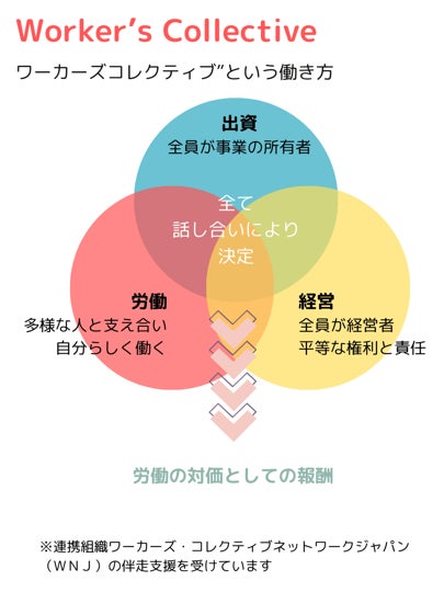 年齢も出身も経験もバラバラな私たちが、どんなカフェにしたいか、どんなカフェがあれば来てくれる人に喜んでもらえるかを考え話し合いました。自分たちの働き方も自分たちで決めるために☆雇う雇われる関係ではなく、自分たちが出資をして経営に責任をもつ。☆それぞれ出来ることを持ち寄ってニガテも助け合う。☆一人一票の権利を持ち共に働く「ワーカーズ・コレクティブ」という新しい働き方を選びました。