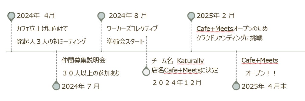 Cafeとしてのこだわりプラス・・・ただ、食事を提供したい場所ではなく、街で暮らす人と一緒に、カフェと居場所 カフェとと学び カフェとコミュニティ カフェとアート カフェと福祉など、Cafeで(+プラス)会う・合う(Meetsミーツ)カフェから始まり、人と人、人と情報がつながる。いろいろな繋がりが+(プラス)されていく事で、このカフェが街と一緒に育っていくようにと思いを込めています