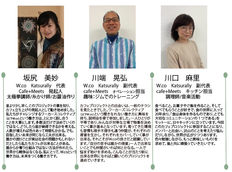 今回みなさんが選んだ「ワーカーズ・コレクティブ」という働き方に、魅力と可能性を感じます。生き方を選ぶ。働き方を選ぶ。自分が主体的に豊かに生きることが周りの人を豊かにする。「Cafe+Meets」を起点に人と人が出会い、つながり、広がっていく景色が私には見えます。共に進みましょう! [knocks!horikawa] 協働運営 「こども基地HOPE」「子どものよりよい育ちを支える会」代表 西村 奈美