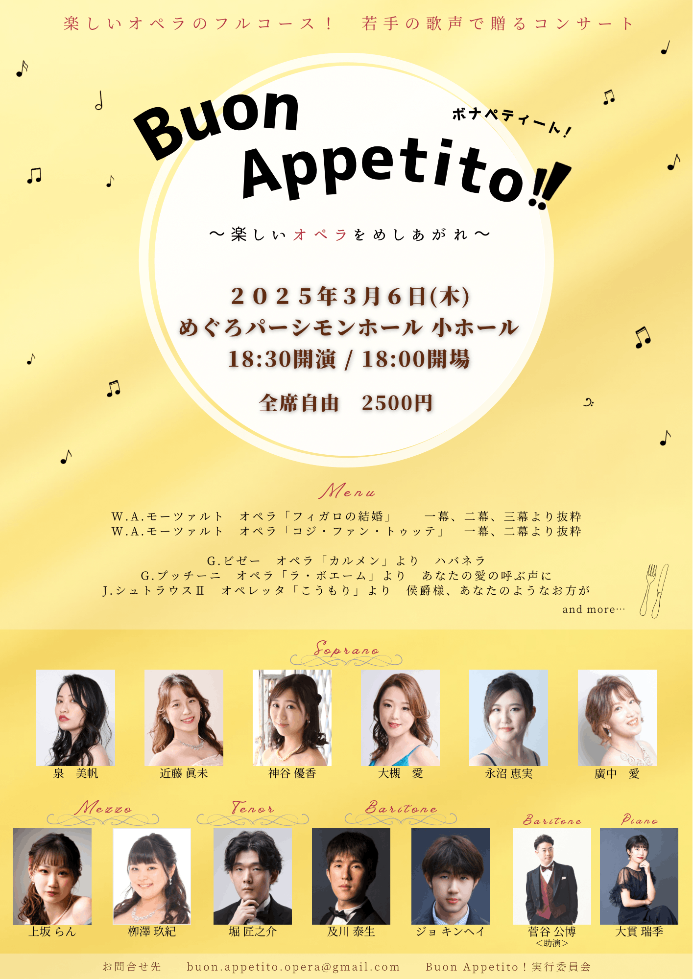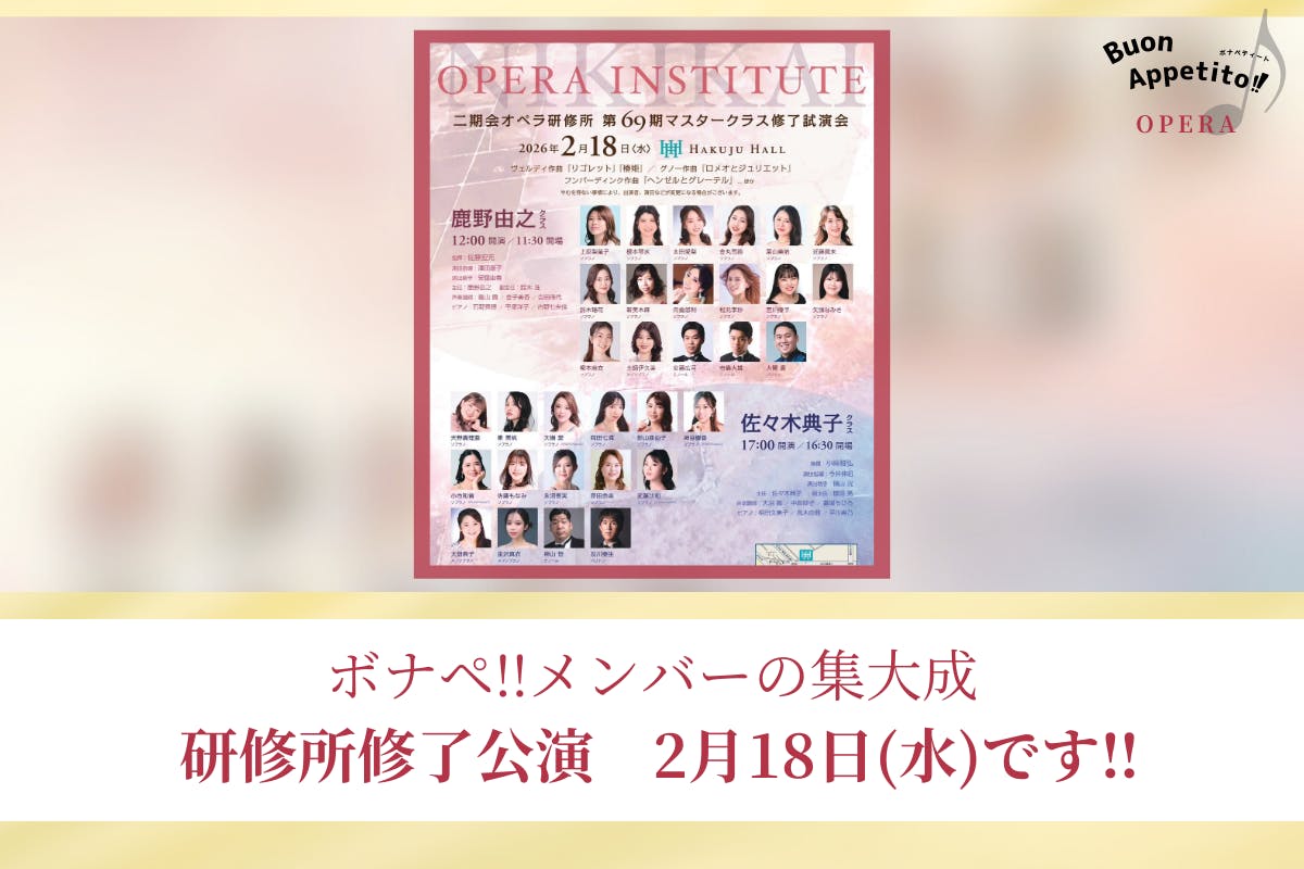 2026/01/25 11:00【ご案内】Buon Appetito!! ~楽しいオペラをめしあがれ~を応援してくださったみなさまへ♪ご無沙汰しております。Buon Appetito!!代表の廣中です。昨年は私たちのコンサートを応援してくださり誠にありがとうございました!新年を迎えてもうじき1か月、寒波に包まれるこの頃ですがお元気でお過ごしでしょうか。★「現役オペラ研修生」たちのその後・・・「現役オペラ研修生のコンサート」と銘打って開催していた「ボナペ!」・・・そんな「現役オペラ研修生」だったメンバーたちがまもなく卒業の時を迎えます・・・!!研修所卒業前の集大成、「修了試演会」が2月18日に白寿ホールにて、公開で行われます(卒業前最後の公開試験!)ボナペ!メンバーの「オペラ研修生」としての最後の姿を、ボナペ!を通して繋がったみなさまに見届けて頂けたらとても嬉しく、この場を借りてご案内申し上げます(´v`*)♪♪二期会オペラ研修所 第69期マスタークラス試演会♪♪▼日時2026年2月18日(水) 昼公演12:00~ / 夜公演17:00~▼会場白寿ホール(小田急線代々木八幡駅・千代田線代々木公園駅 徒歩5分)▼公演詳細・チケットお取り扱い (残りわずかのようです…!)二期会公式HP:第69期マスタークラス試演会▼内容オペラハイライト形式(字幕あり)様々なオペラから抜粋したシーンに、各生徒が取り組んだ成果を披露します▼チケット料金2000円 (昼・夜通し券 3000円)●鹿野クラス/12:00開演組 に出演するボナペ!メンバー・・・近藤眞未●佐々木クラス/17:00開演組 に出演するボナペ!メンバー・・・泉美帆、大槻愛、神谷優香、永沼恵実、及川泰生当日スタッフをしてくれていたメンバー・・・岡田七海、武藤沙和★自主公演「Buon Appetito!!」から約1年・・・ボナペっ子たちの成長した姿をぜひ会場でご覧ください♪「オペラって楽しい!」『現役オペラ研修生』の、あの熱い熱いエネルギーに、もう一度、会いに来てください~~~!!!(ちなみに、代表 廣中はお休み中のため、両公演とも客席で応援しますよ~!一緒に会場で、メンバーに拍手を送りましょう~(^^)! )▼公演詳細・チケットお取り扱い二期会公式HPからご確認いただけます ≫第69期マスタークラス試演会 もっと見る