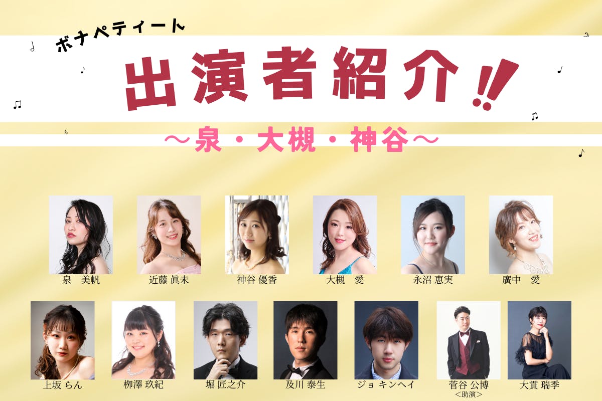 皆様こんにちは! ボナペティート!クラファン係です♪3月に入り、春めいた心地の良い土曜日ですね(*^^*)♪今回も前回に引き続き、公演に向け出演者紹介 パート2をお届けしたいと思います♡今回も色とりどりのソプラノメンバー3名です♪近藤 眞未|こんどう まみ (愛称:まみち)まさに彼女は福井美人、初対面から彼女の美貌に釘付けでした…心地良いソプラノの歌声、美しい身のこなしに虜にされちゃうこと間違いなし!永沼 恵実|ながぬま えみ (相性:えみつん)あら、こちらには板橋美人、板橋美人です。滑らかかつ清らかな歌声は、あなたの心を木々のように癒すでしょうちなみにモノマネさせると一流です。廣中 愛|ひろなか あい (相性:あいさん)メンバー唯一の関西生まれ、大阪弁を携えて登場するは、我らが代表、愛さんです。豊かな音楽性と、栄養をくれる太陽のようにキラっとした歌声は聞いてる人を元気にさせます。口癖は、「標準語で喋ってるやんか」です。今回も、前回に引き続き、濃〜いメンバーの紹介でございました!一人一人の魅力を味わえる、≪ボナペティート≫、3月6日(木) めぐろパーシモンホールにて開演です!実はありがたいことに、残席が限られてきています…!この機会にぜひ、お見逃しなく!*今ならまだ間に合います! ≫ Buon Appetito!!チケット申し込みフォーム以上、クラファン係・メゾソプラノ上坂(こうさか)がお届けいたしました☺︎