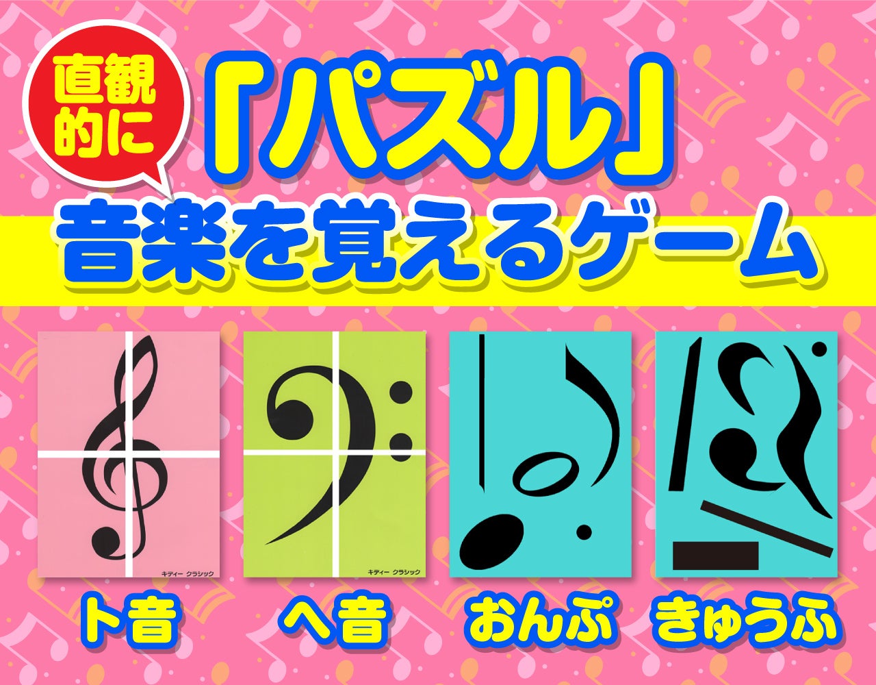 音楽を覚えるゲームをパズル形式でおもちゃのシンフォニーのBGMにのって 軽快にパズルしていくと むつかしい音楽用語や記号 音符が遊びの延長の中から覚えられます。