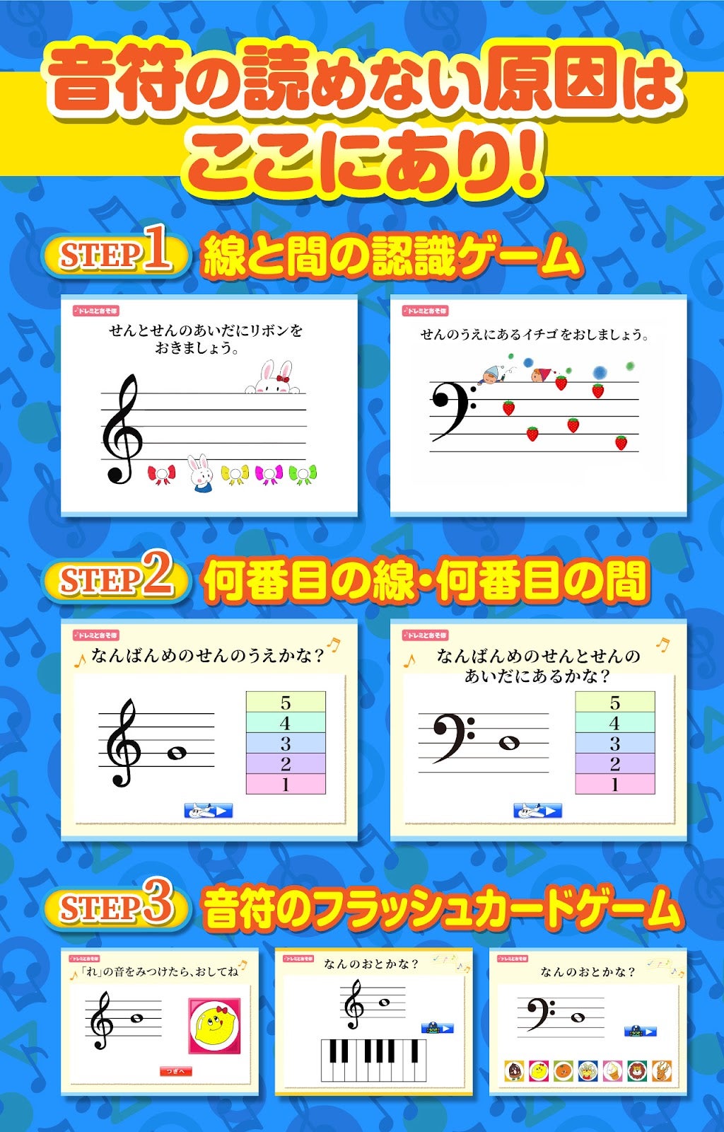 ゲームは『ドレミとあそぼ! とおんきごう編』『ドレミとあそぼ! へおんきごう編』それぞれ15種類ずつあり、計30のバリエーション。遊びながら反復練習を繰り返すことで、あっという間に譜読みをマスターできます。