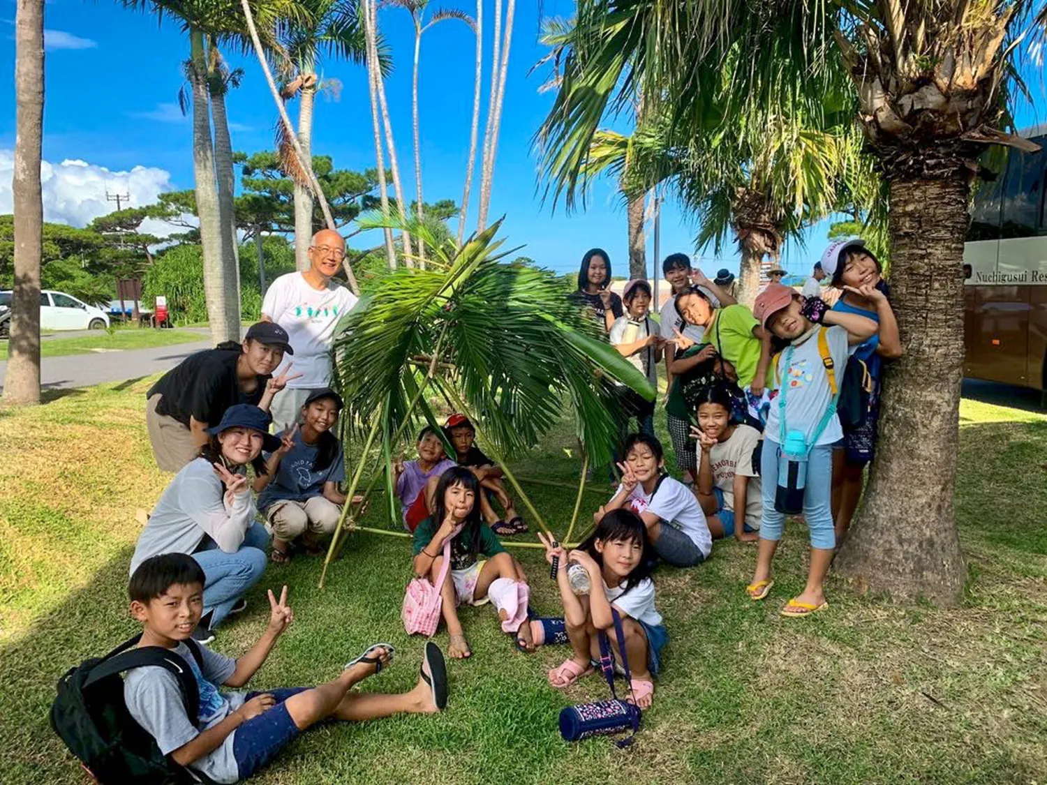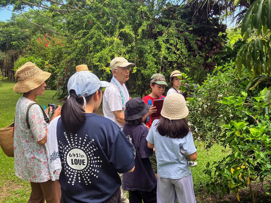 小学生から中学生を対象に、月桃を使った空間づくり のワークショップを開催しました!子どもたちは、月桃の茎を使って自分たちで構造を考えながら組み立て、おうちをつくる体験に挑戦しました。さらに、よりここちのよい空間にするために、自分たちで葉っぱを集めて屋根を作る という工程にも挑戦しました。どんな形がしっくりくるのか、どうすれば太陽を遮り快適に過ごせるのか、試行錯誤しながら進めていきました。