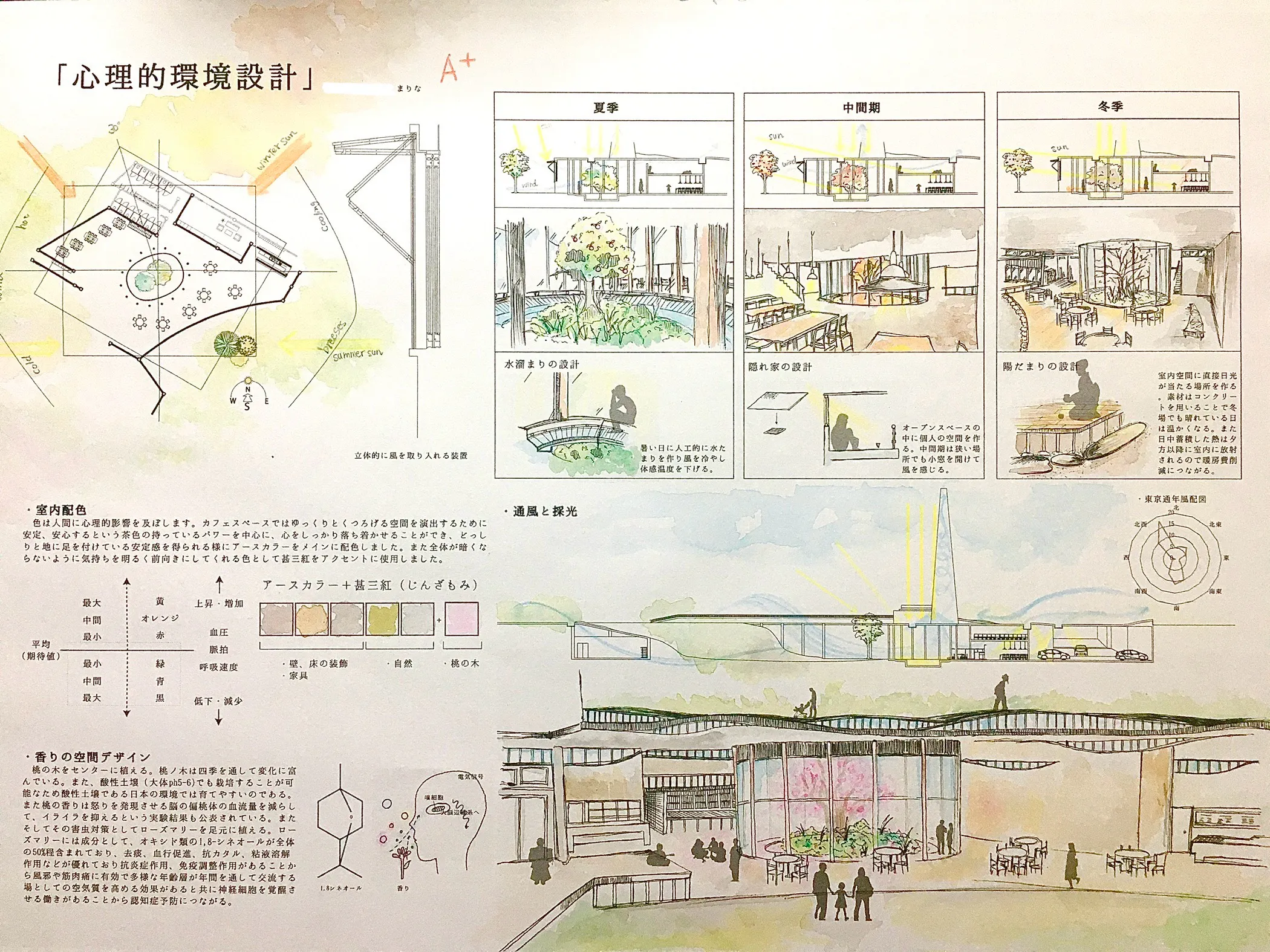 これらの経験を背景の一つに、大学では建築と自然がどのように共鳴し、人の感性を刺激するのかに関心を持つようになりました。研究や設計課題を通して環境建築は、単にエネルギー負荷を減らすためのものではなく、屋外に開けることで風や光、温度や湿度、熱、そしてにおいなどを通して、人々の感性を開き、日常に新たな気づきやインスピレーションをもたらすことを学びました。