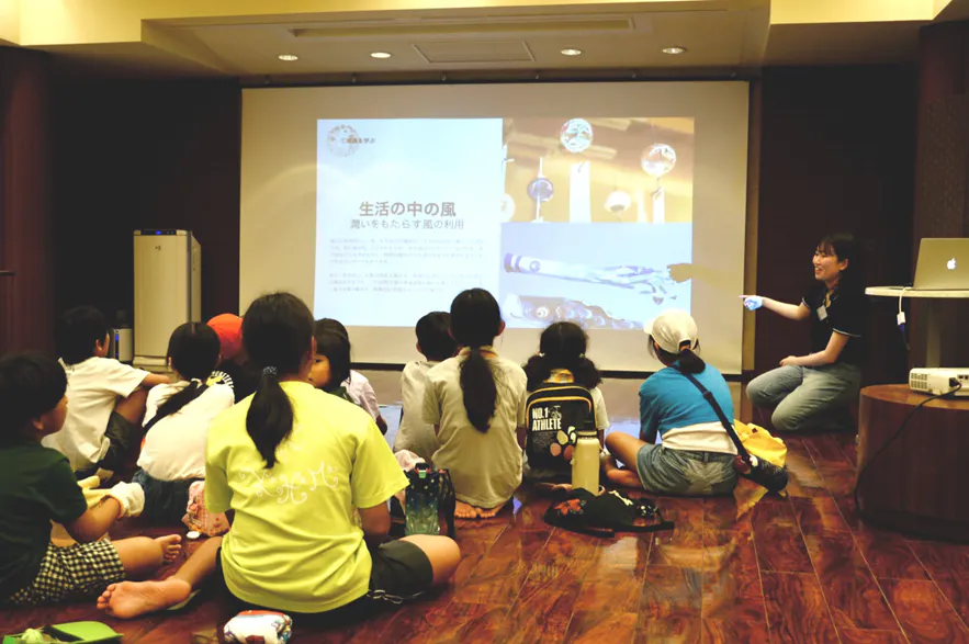 未就学児から小学校低学年の子どもたちを対象に、「風をつかまえよう!」 をテーマにしたワークショップを開催しました。完成したおもちゃを持って走ると、風を受けてふわりと揺れる葉っぱやリボン。子どもたちは、夢中で走り回りながら、向かい風・追い風など、風の種類にも気づいていきます。