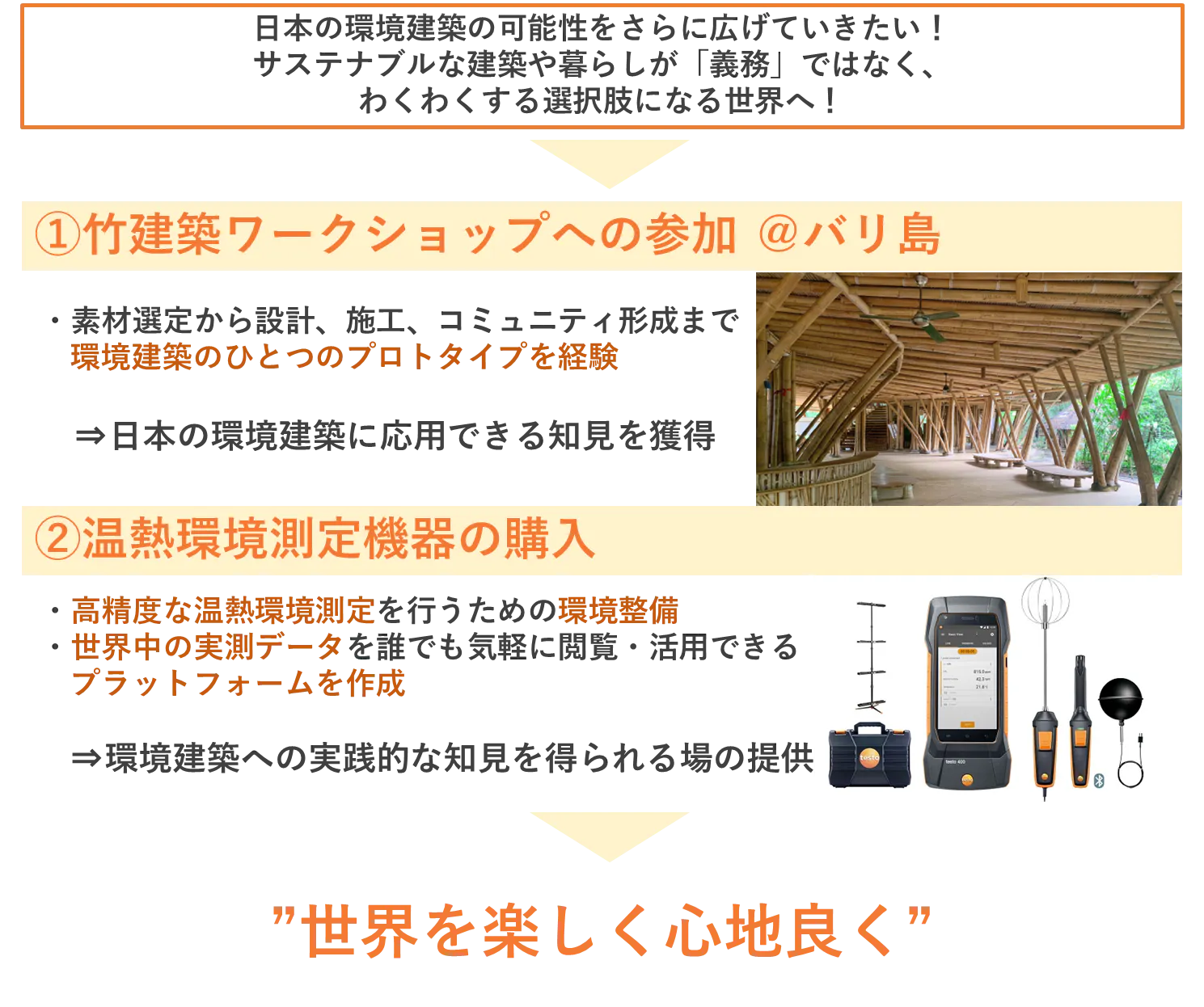 ただ、この挑戦を実現するためには、多くの方々のサポートが必要です。講習会の受講費や渡航費、滞在費はもちろん、環境測定器の購入も重要な要素となります。特に、環境建築を学び、実践するうえで、精度の高いデータは欠かせません。しかし、安価な測定器では正確な結果が得られず、せっかく得た貴重な経験を十分に活かしきれません。仮に、データの傾向をつかむことはできても、それを自信をもって「人にシェアするには、不安が残る・・・。」そんなもどかしさがあります。だからこそ、より正確な測定を行うための環境を整え、データの精度を高めることが不可欠です。