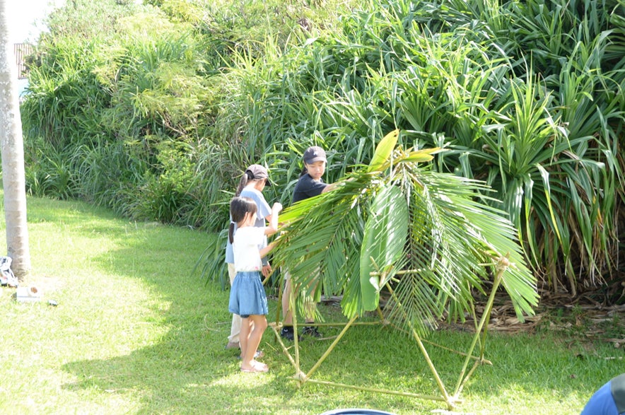 小学生から中学生を対象に、月桃を使った空間づくり のワークショップを開催しました!子どもたちは、月桃の茎を使って自分たちで構造を考えながら組み立て、おうちをつくる体験に挑戦しました。さらに、よりここちのよい空間にするために、自分たちで葉っぱを集めて屋根を作る という工程にも挑戦しました。どんな形がしっくりくるのか、どうすれば太陽を遮り快適に過ごせるのか、試行錯誤しながら進めていきました。