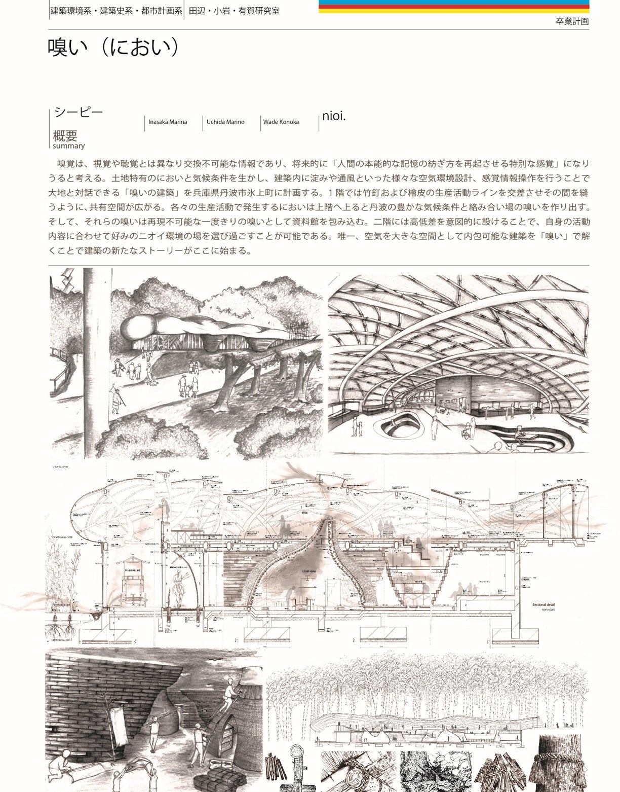 これらの経験を背景の一つに、大学では建築と自然がどのように共鳴し、人の感性を刺激するのかに関心を持つようになりました。研究や設計課題を通して環境建築は、単にエネルギー負荷を減らすためのものではなく、屋外に開けることで風や光、温度や湿度、熱、そしてにおいなどを通して、人々の感性を開き、日常に新たな気づきやインスピレーションをもたらすことを学びました。