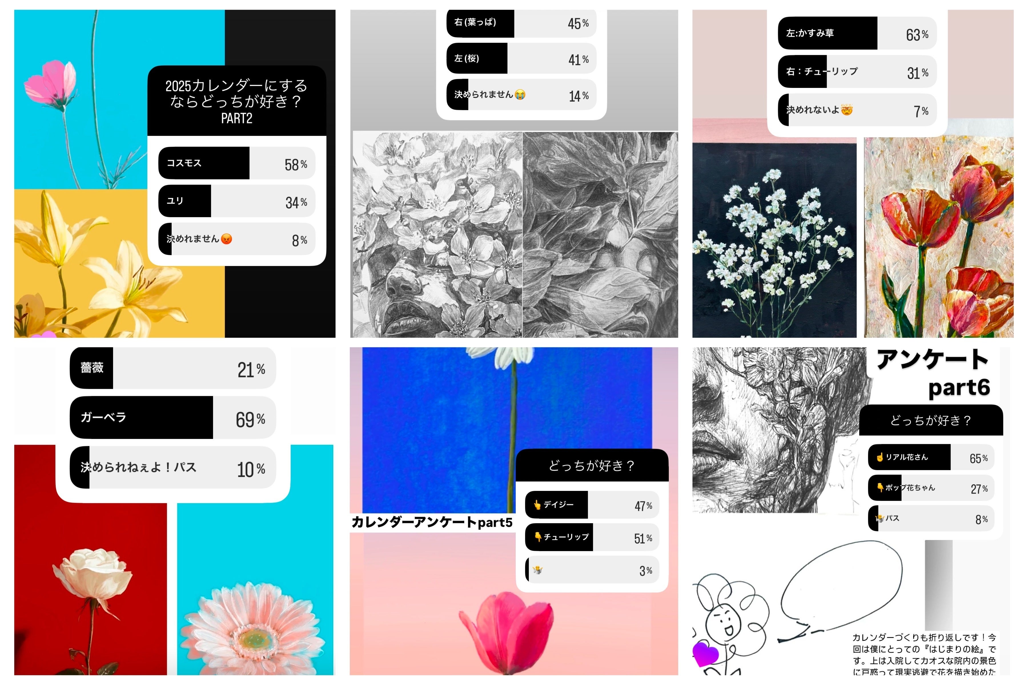 それまで描いた花の絵の中から、のべ5000人以上に採用する絵を決めていただきながら、年末にカレンダーを販売。SNSでの投票結果