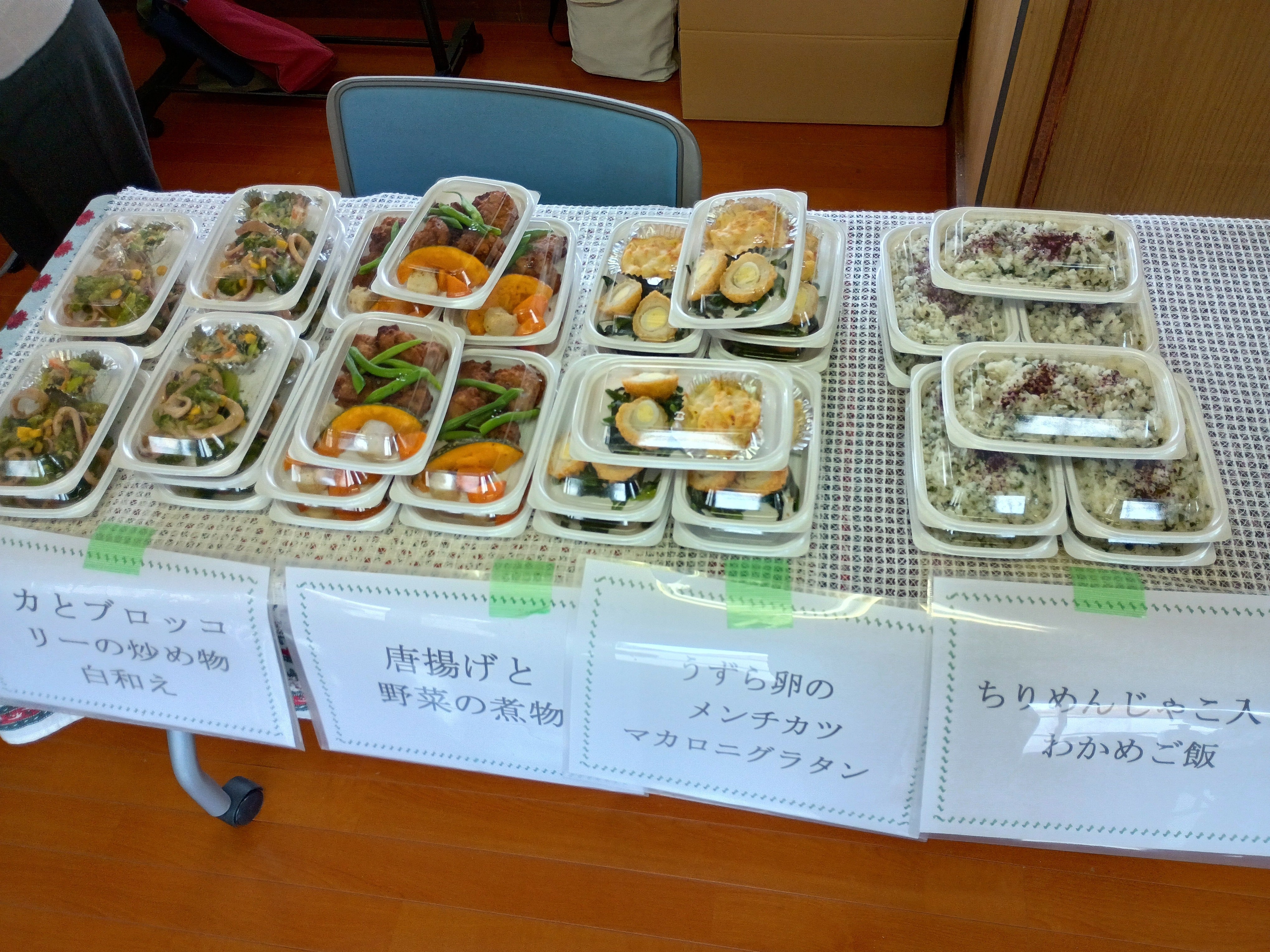市営住宅5か所を対象に、4日と5日の2日間で、そのうちの4か所で支援を実施いたしました。写真は、冷凍の業務用食材やフードドライブで提供された野菜などを活用し、自前のキッチンで調理した総菜です。参加された皆さまに大変喜んでいただいております。