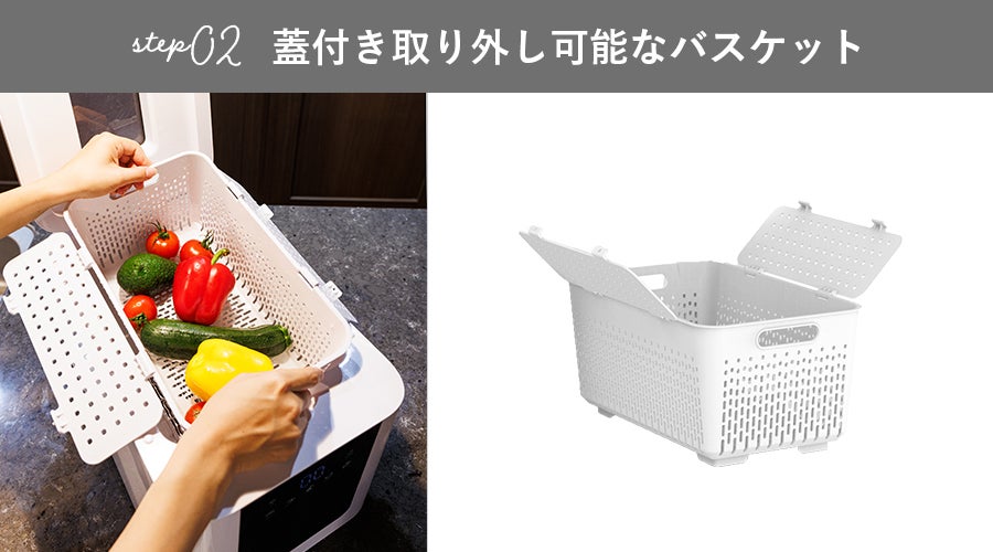 1.トップカバーを開け、バスケット内へ野菜や果物を入れます。