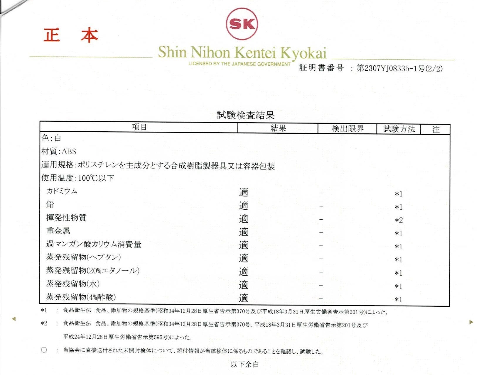 食品衛生試験を(一財)新日本検定協会 SK横浜分析センターで行い合格済みです。
