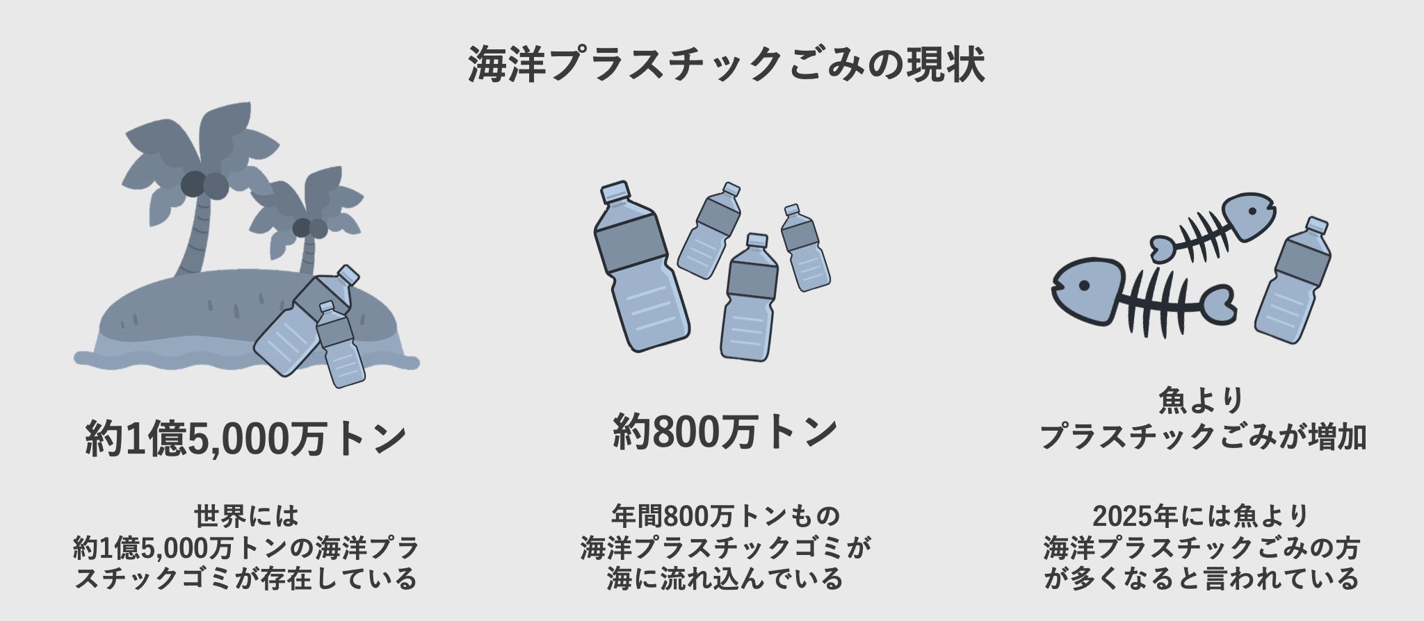 現在、世界の海には約1億5000万トンのプラスチックごみが存在し、年間800万トンもの新たなプラスチックごみが海に流入しています。このままでは2050年には魚よりもプラスチックごみの方が多くなると言われています。