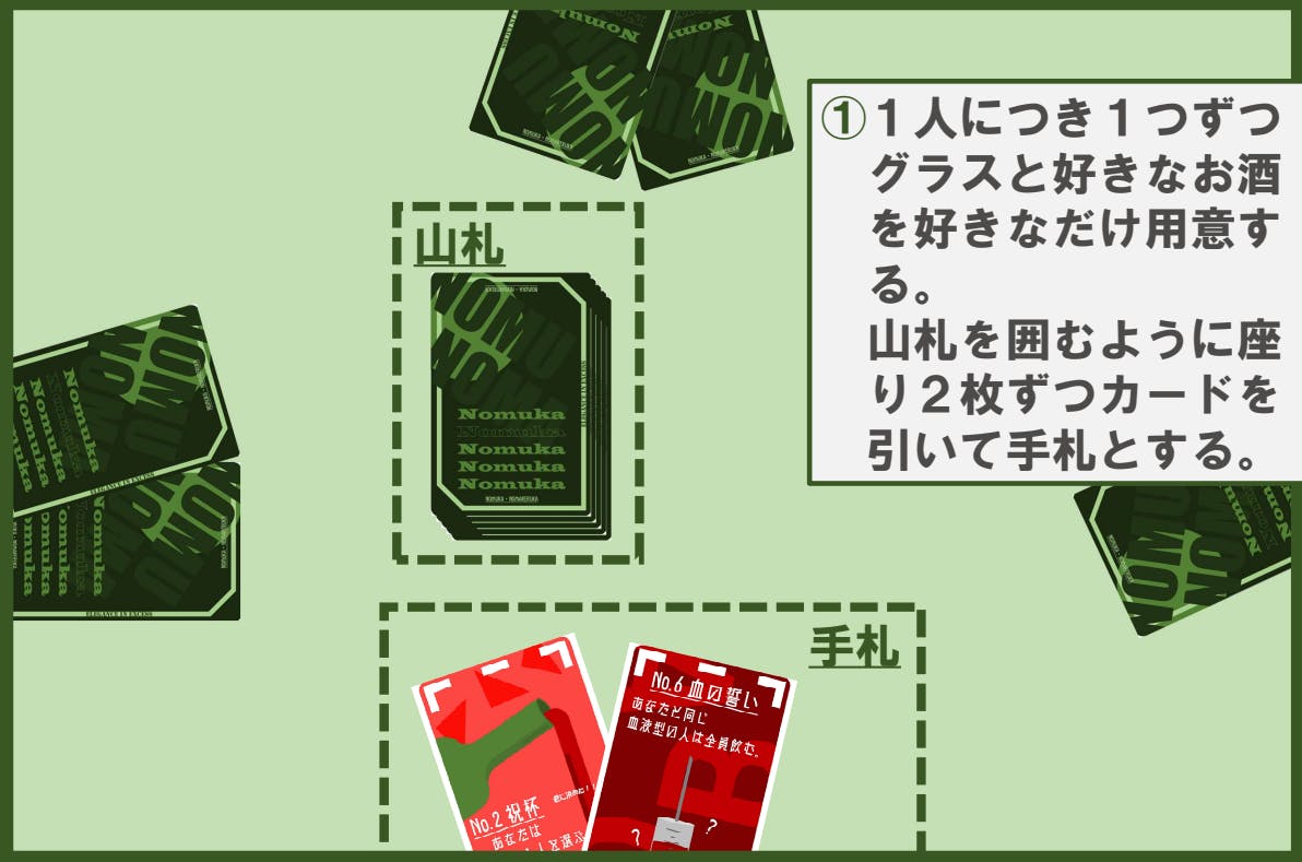 まず、一人につき一つずつグラスを用意します。次にカードをシャッフルして山札として中央に置き、それを囲むように座ります。そのあとに、一人2枚ずつカードを引いたら準備は完了です。
