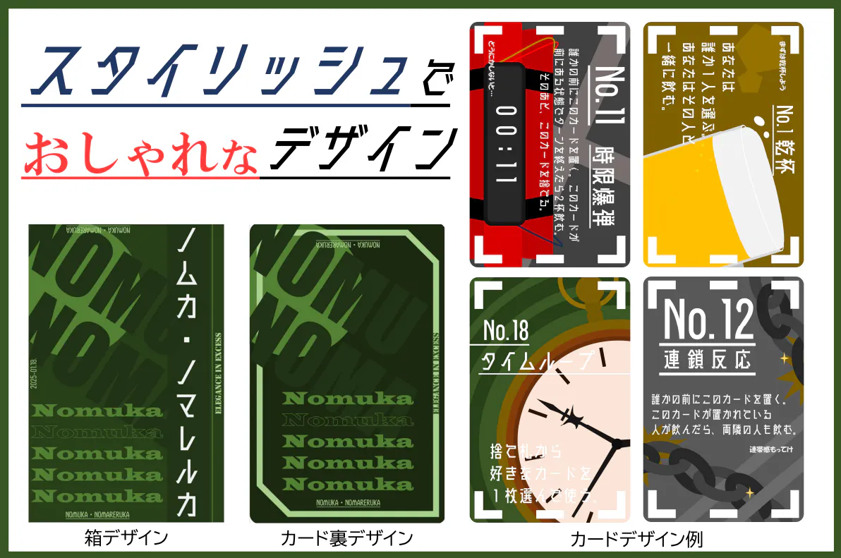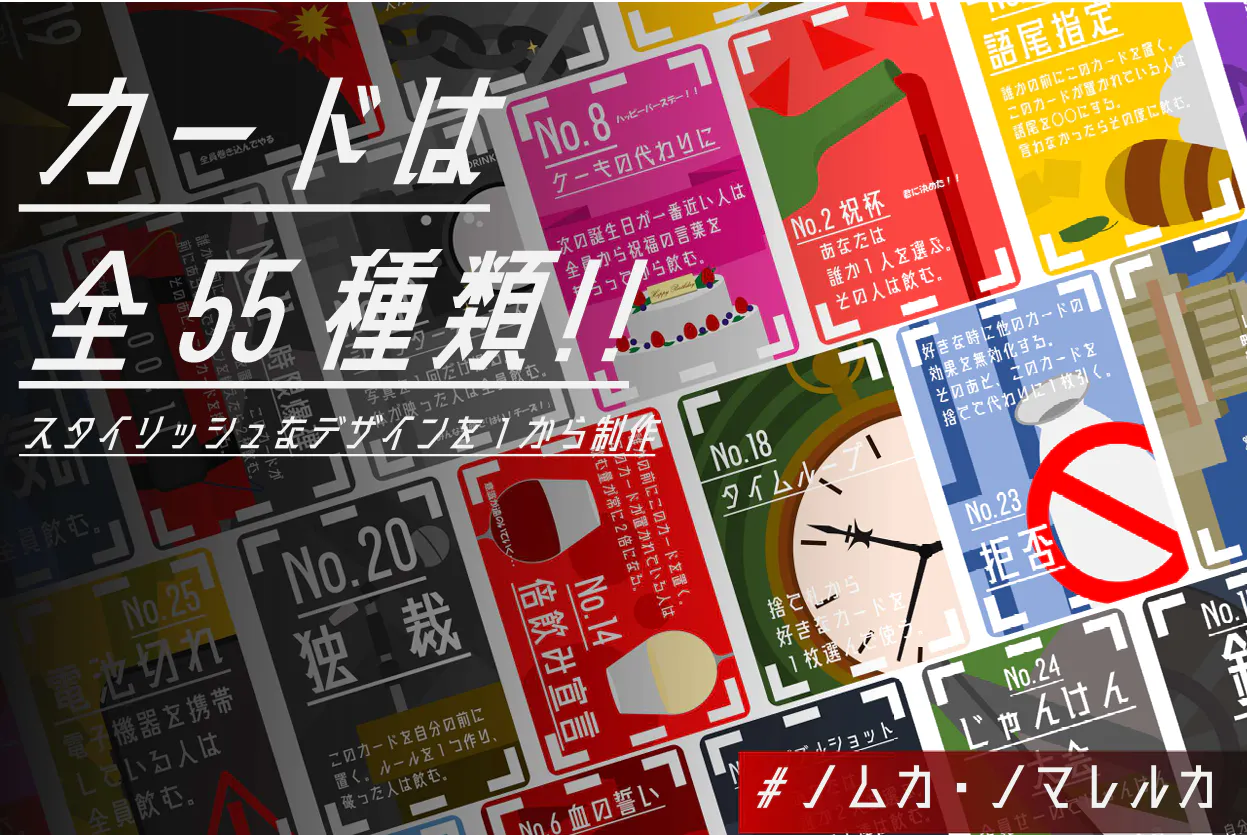 55枚のカードはそれぞれ効果が異なります。自分ができるだけアルコールを飲まないように、もしくは他のプレイヤーにたくさん飲ませられるように立ち回りましょう!
