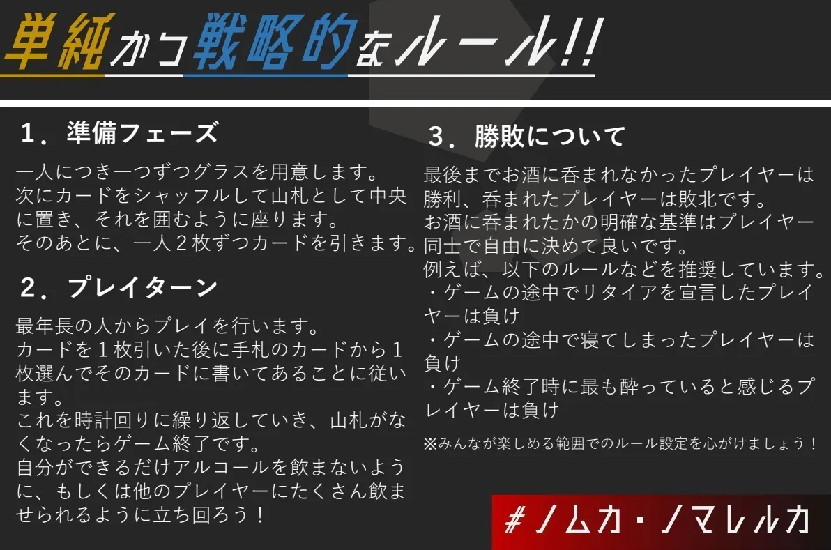 ・ゲーム終了時に最も酔っていると感じるプレイヤーは負け(プレイヤー間での主観的判断)