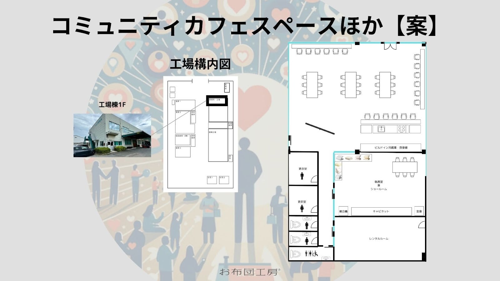工場棟1Fの執務室・食堂・会議室・更衣室・トイレのスペースを作業場寄りに拡張し、そのスペースにコミュニティカフェスペース、レンタルルーム、ショールームなどの要素を充てた、現在の構想案はこちらです。
