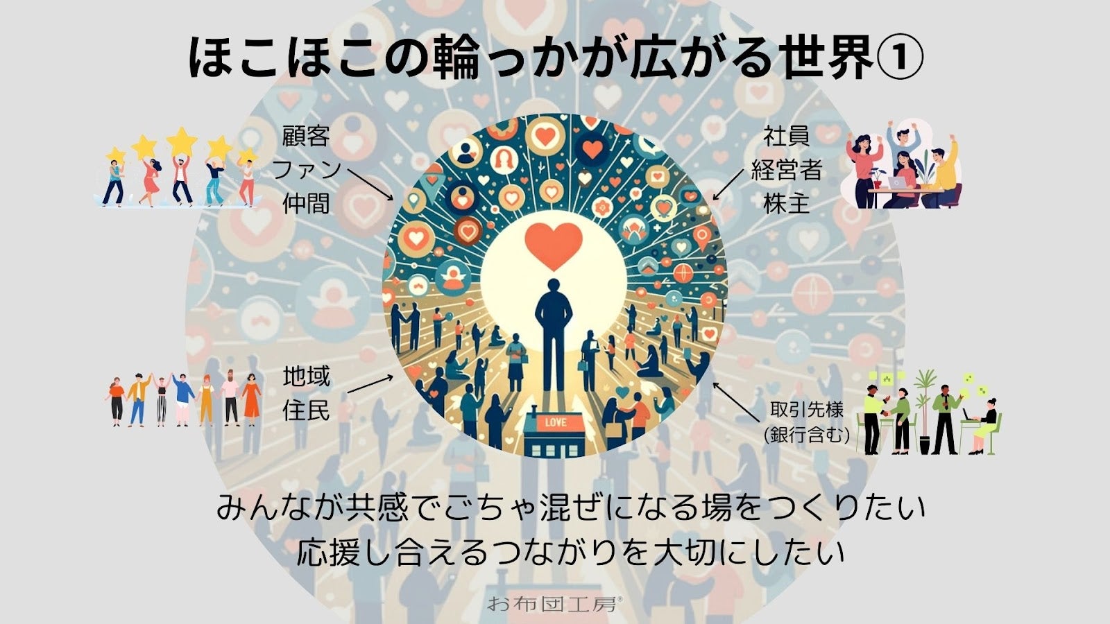 2024年8月に開催された創業150周年記念パーティーで、社員や来場いただいた取引先、仲間のみなさんにこれからの会社方針として【ほこほこの輪っかが広がる世界】という構想をお話しさせていただきました。