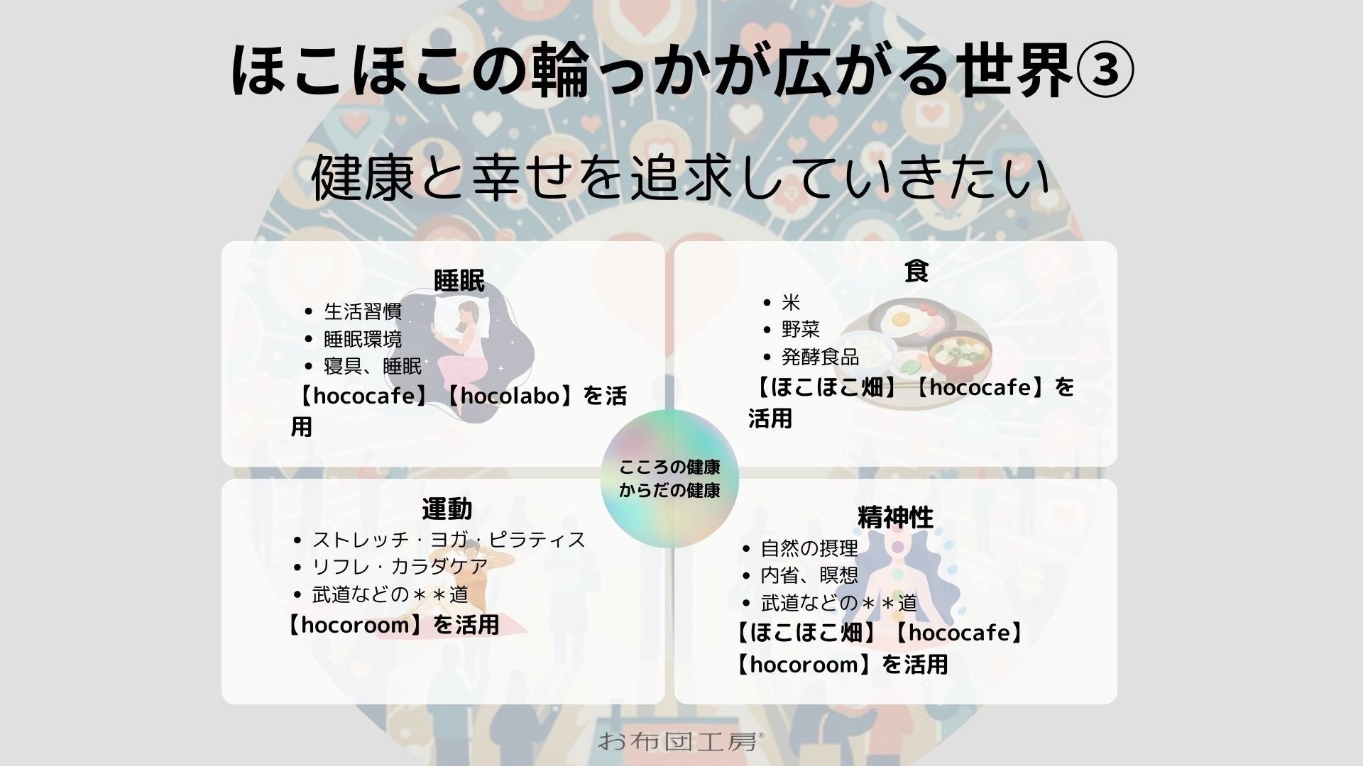 お布団工房では、ふとんと眠りの研究所「hocolabo」を設け、睡眠の質をより良くするため、寝具が及ぼす影響だけでなく、【食】・【運動】・【精神性】のそれぞれと【睡眠】との関連の中から健康を考えていきたいと思っています。つまりは、【食】・【運動】・【精神性】によって、【睡眠】がどう作用するのかを探求していきたい。よって、【睡眠】をど真ん中に位置づけてお布団工房らしさもしっかり出していきたいのです。