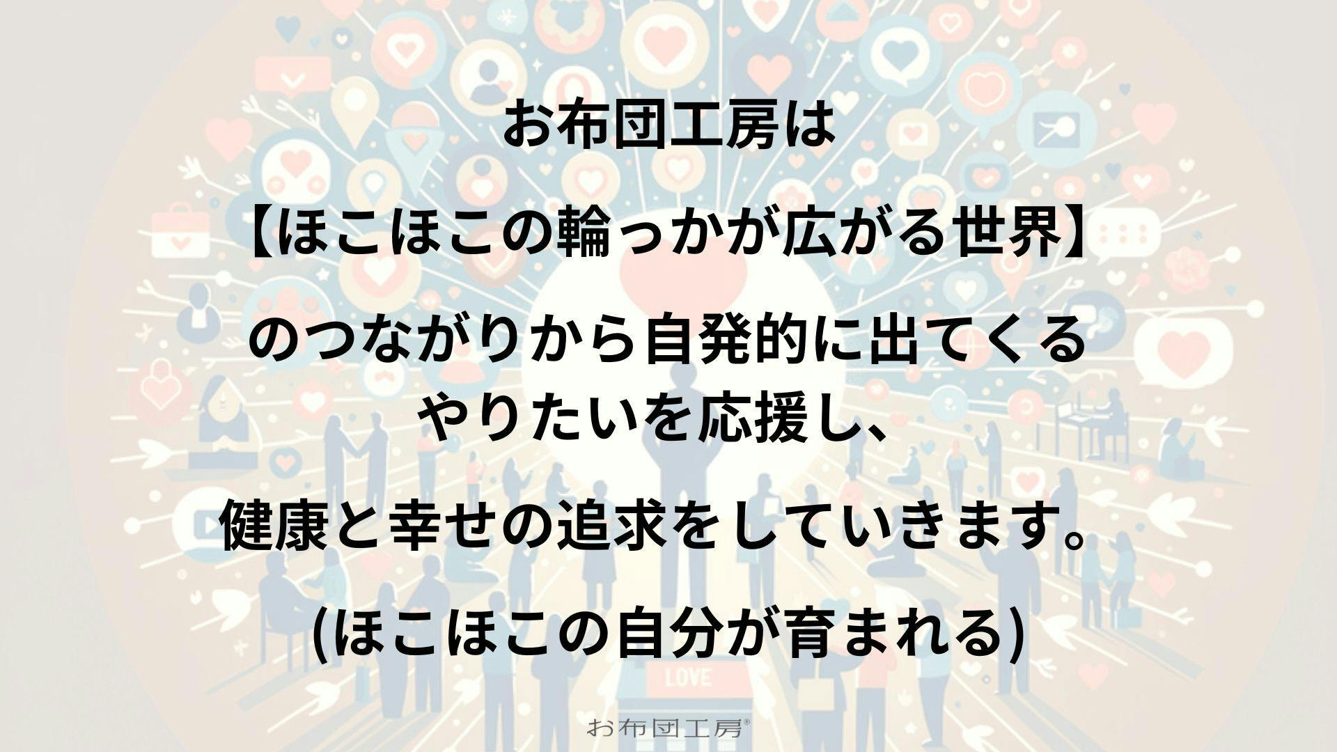 お布団工房は、【ほこほこの輪っかが広がる世界】のつながりから自発的に出てくるやりたいを応援し、健康と幸せの追求をしていきます。
