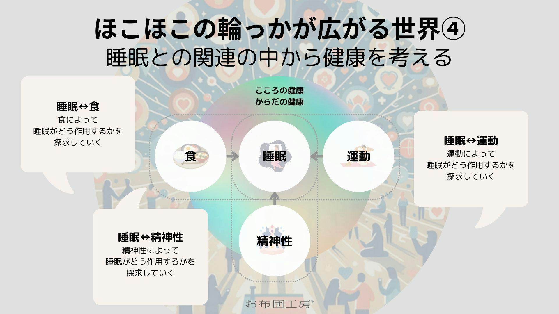 お布団工房では、ふとんと眠りの研究所「hocolabo」を設け、睡眠の質をより良くするため、寝具が及ぼす影響だけでなく、【食】・【運動】・【精神性】のそれぞれと【睡眠】との関連の中から健康を考えていきたいと思っています。つまりは、【食】・【運動】・【精神性】によって、【睡眠】がどう作用するのかを探求していきたい。よって、【睡眠】をど真ん中に位置づけてお布団工房らしさもしっかり出していきたいのです。