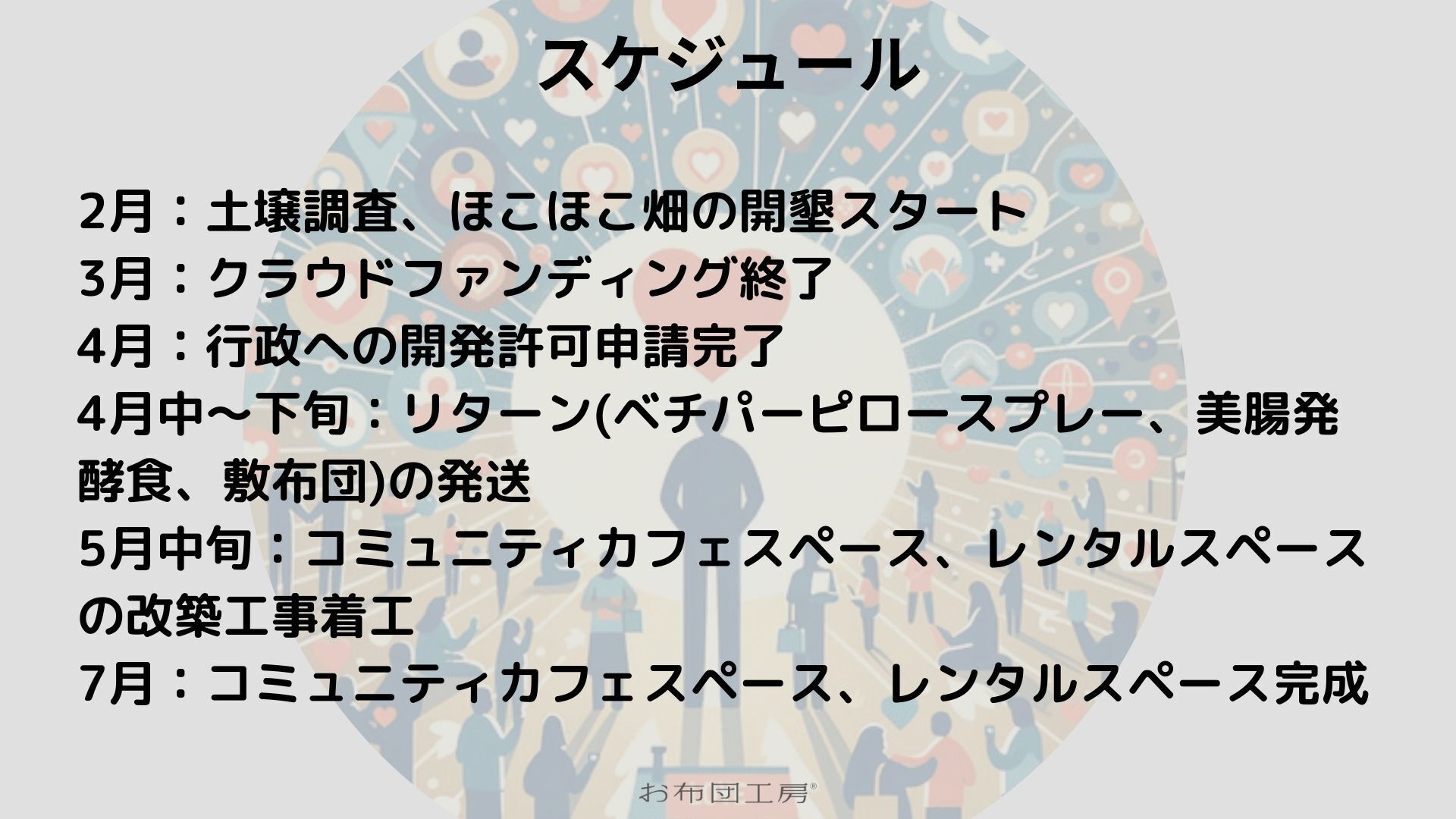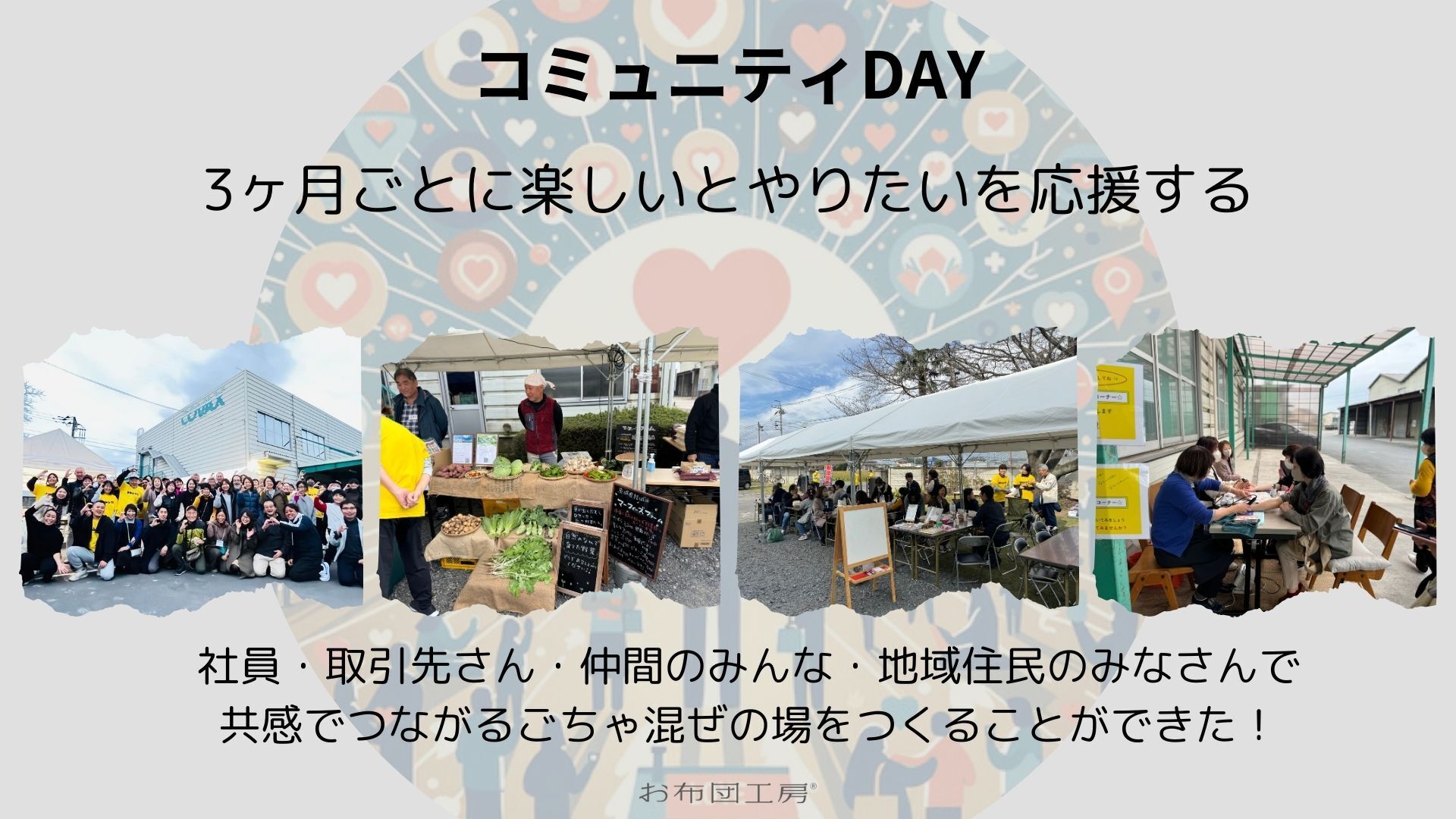 お布団工房では、それらを実現するため、会社敷地内にコミュニティ畑やコミュニティカフェスペースを設け、地域住民のみなさんをはじめ、社員、顧客さま、取引先さま、わたしたちの想いに共感する仲間など、あらゆる人がごちゃ混ぜになる空間をつくり、そして、健康と幸せの追求(【食】【運動】【睡眠】【精神性】)を通して、体験する場をつくっていきたいと考えています。