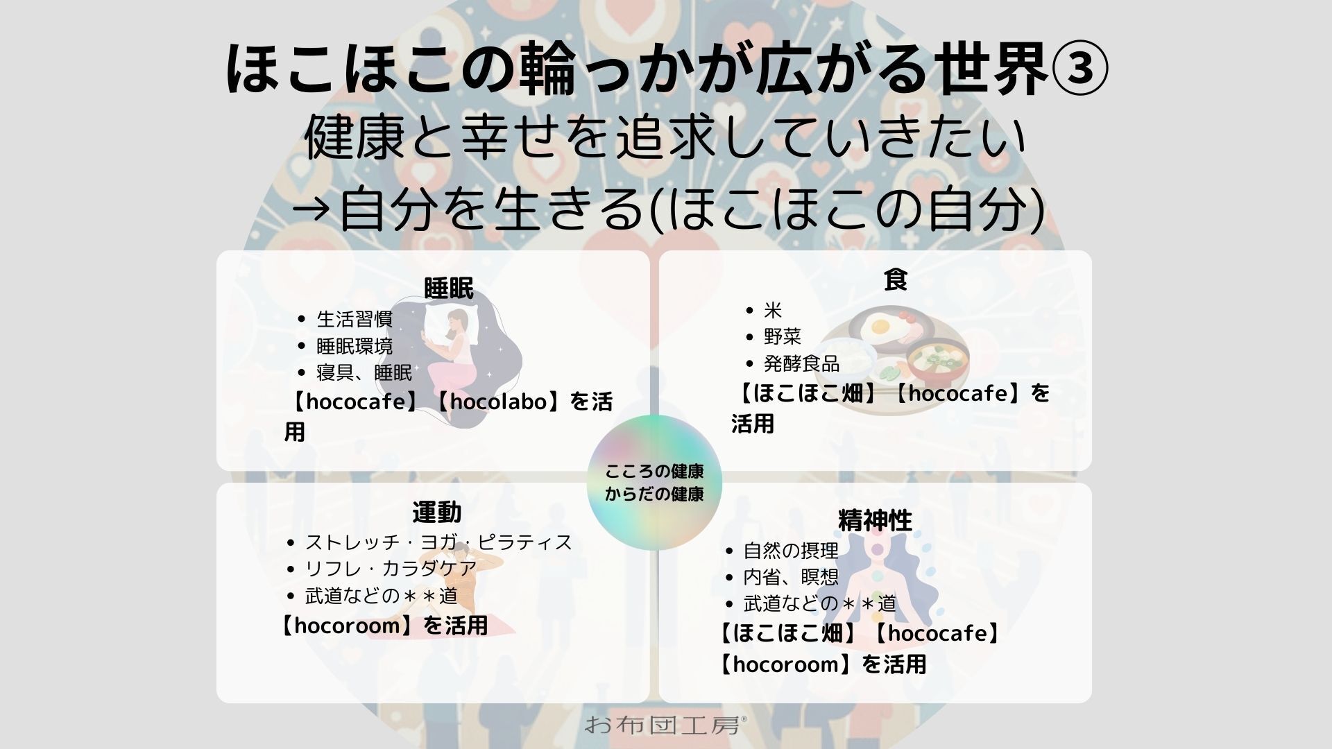 お布団工房では、ふとんと眠りの研究所「hocolabo」を設け、睡眠の質をより良くするため、寝具が及ぼす影響だけでなく、【食】・【運動】・【精神性】のそれぞれと【睡眠】との関連の中から健康を考えていきたいと思っています。つまりは、【食】・【運動】・【精神性】によって、【睡眠】がどう作用するのかを探求していきたい。よって、【睡眠】をど真ん中に位置づけてお布団工房らしさもしっかり出していきたいのです。